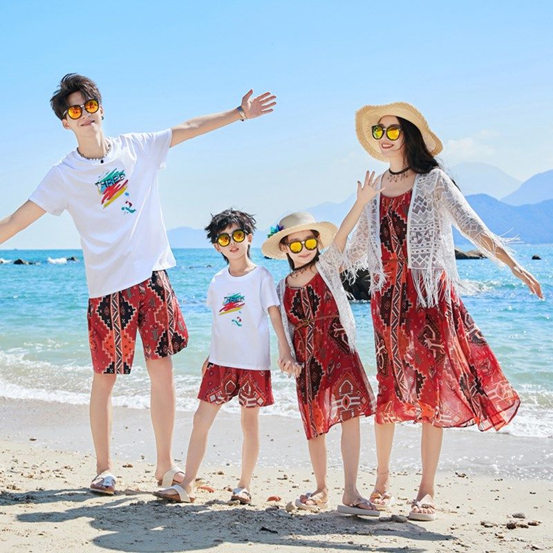 亲子装海边度假沙滩裙一家三口母女装大码显瘦吊带连衣裙长裙三亚
