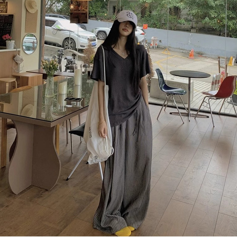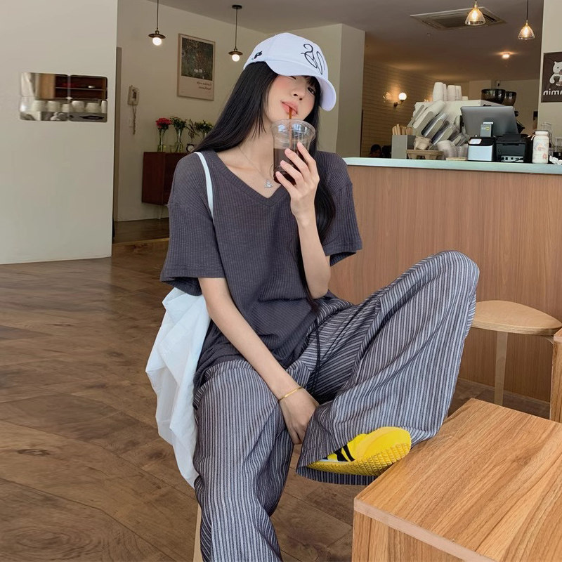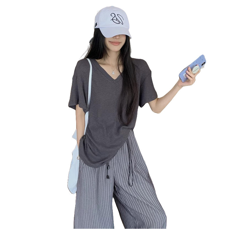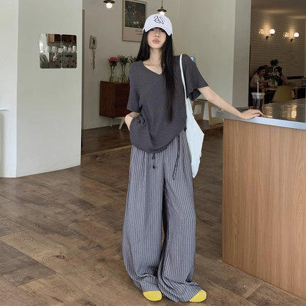 慵懒风孕妇装夏装纯棉套装2025新款韩版V领上衣百搭条纹阔腿裤子