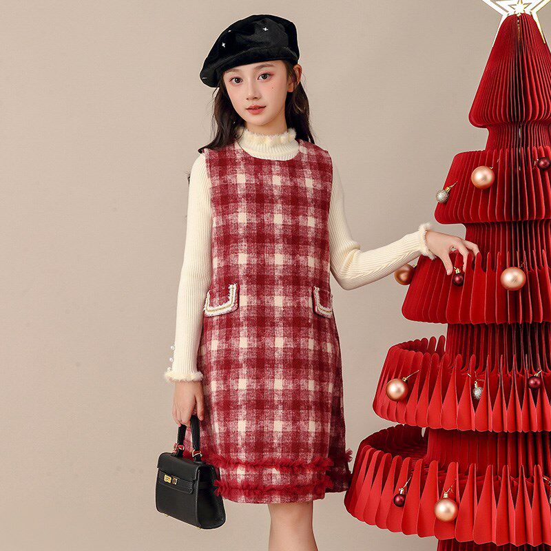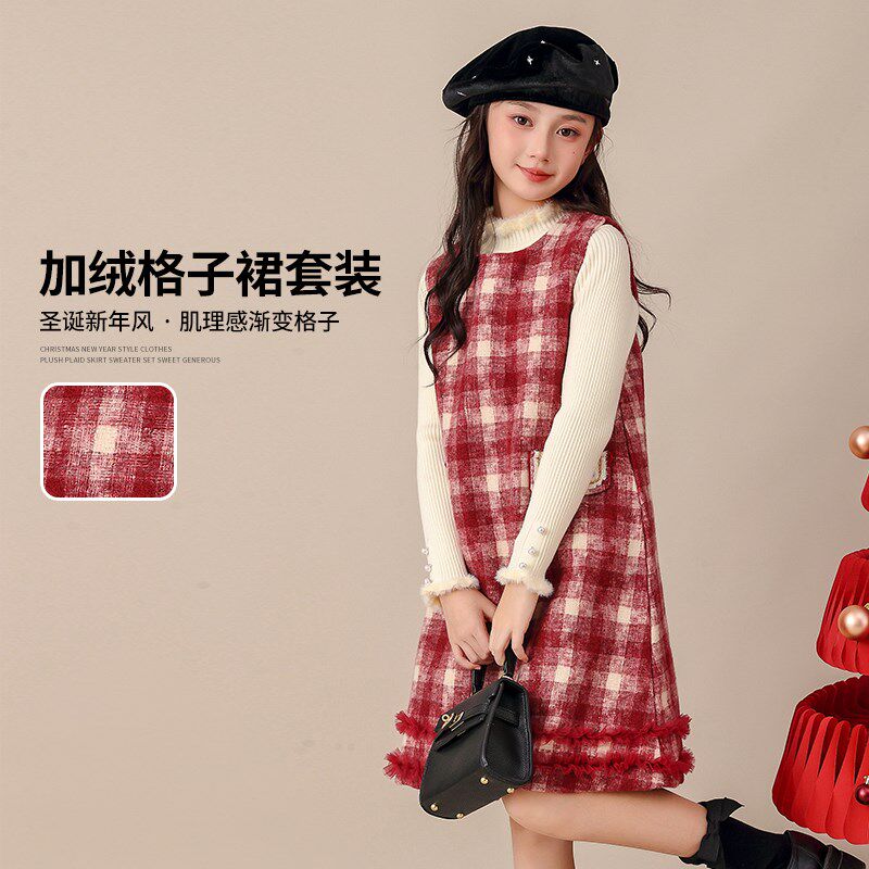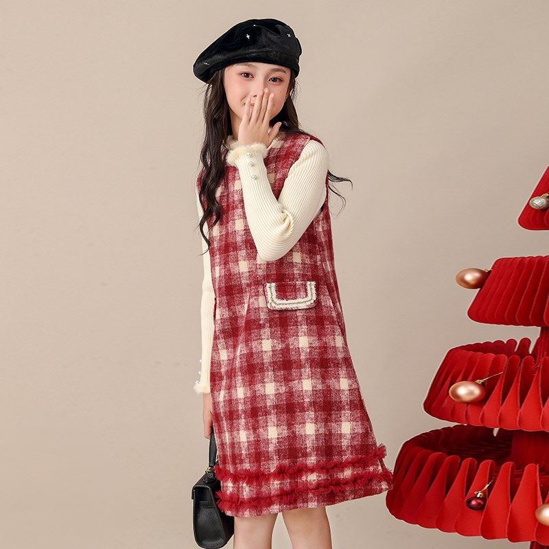 儿童裙子女童连衣裙秋冬洋气红色冬装大童小女孩新年冬季套装衣服