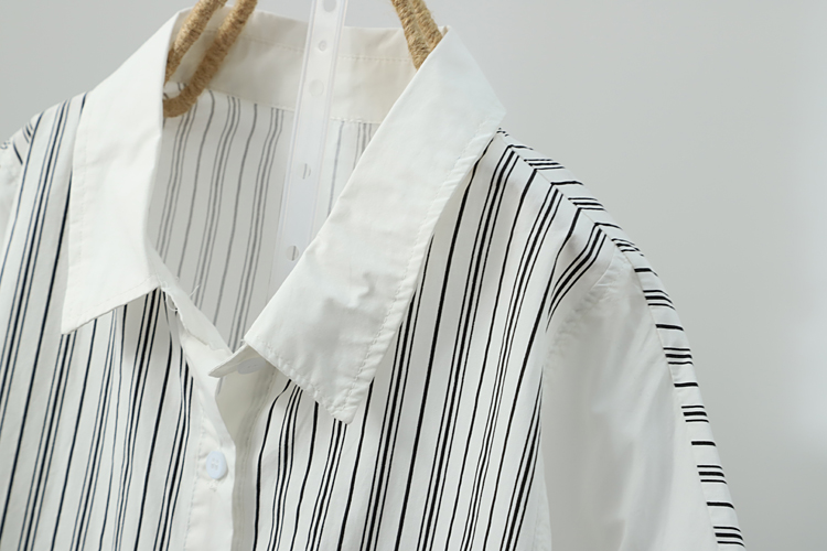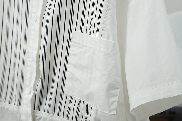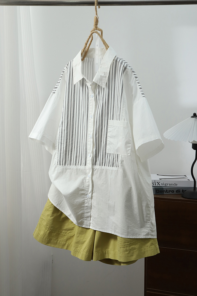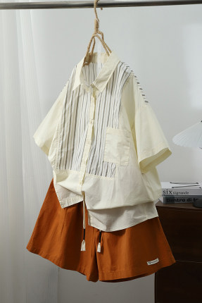琴川谷2023夏季新款条纹拼接纯棉短袖衬衫女宽松显瘦短款小衫百搭