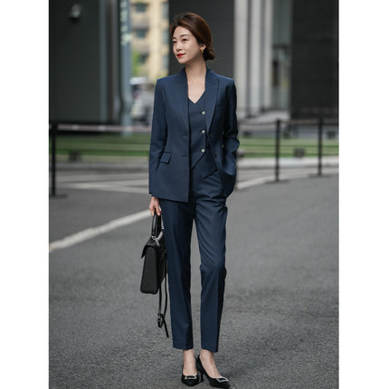 春秋冬新藏蓝色精纺羊毛职业正装西装高级感商务面试OL马甲套装女
