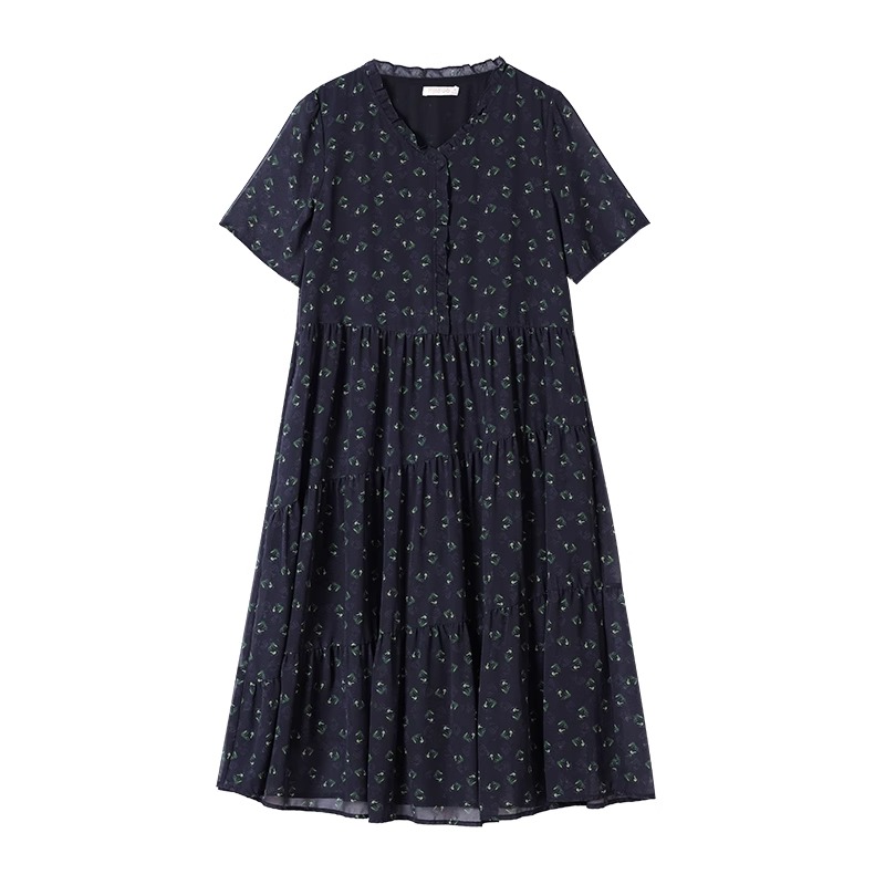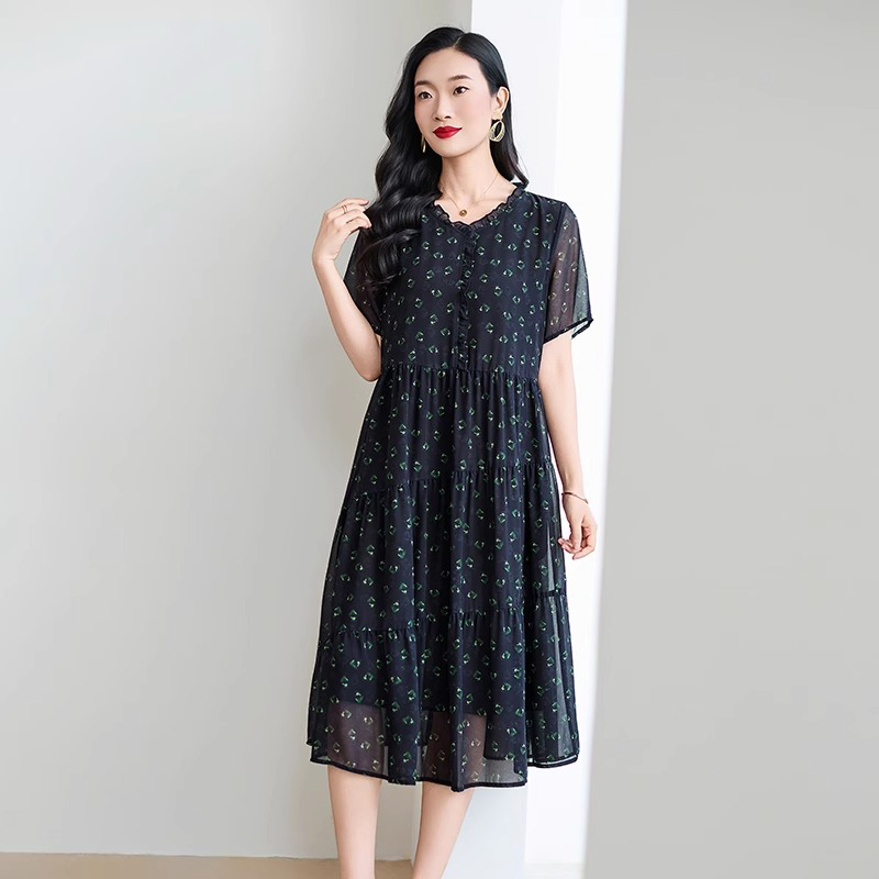 2025夏季女优雅气质短袖度假风连衣裙气质法式长裙木耳边印花大码