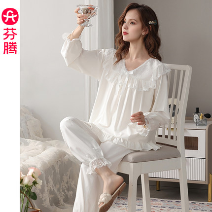 芬腾春秋季女士睡衣纯棉长袖蕾丝套装女款宽松休闲大码白色家居服