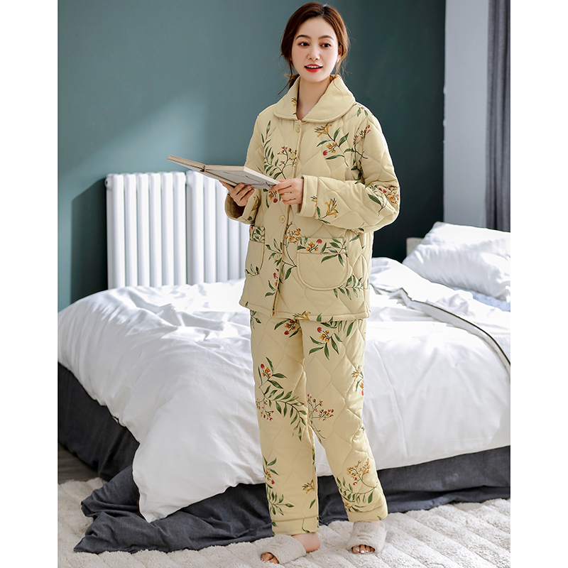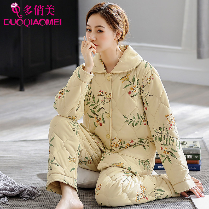 纯棉夹棉睡衣女秋冬款中年妈妈全棉服保暖加厚冬季冬天家居服套装
