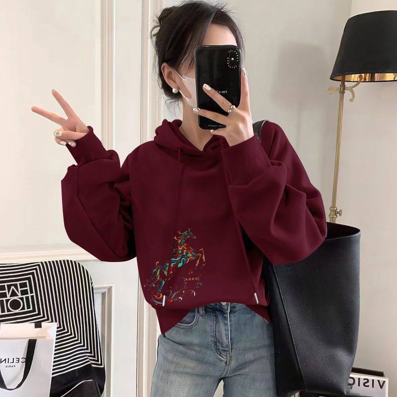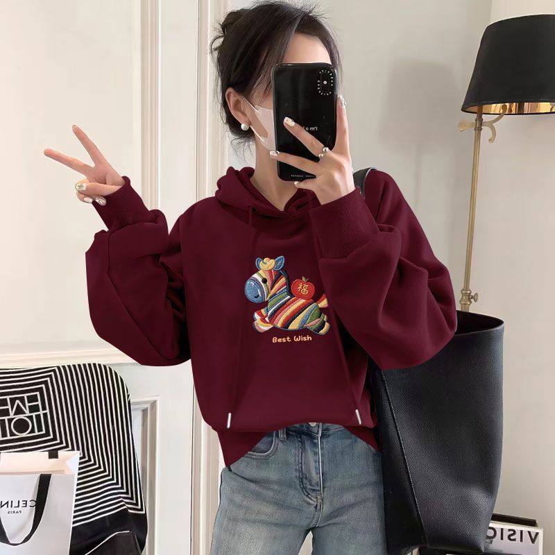 纯棉短款长袖卫衣女新款秋冬连帽本命年宽松气质马年休闲上衣女
