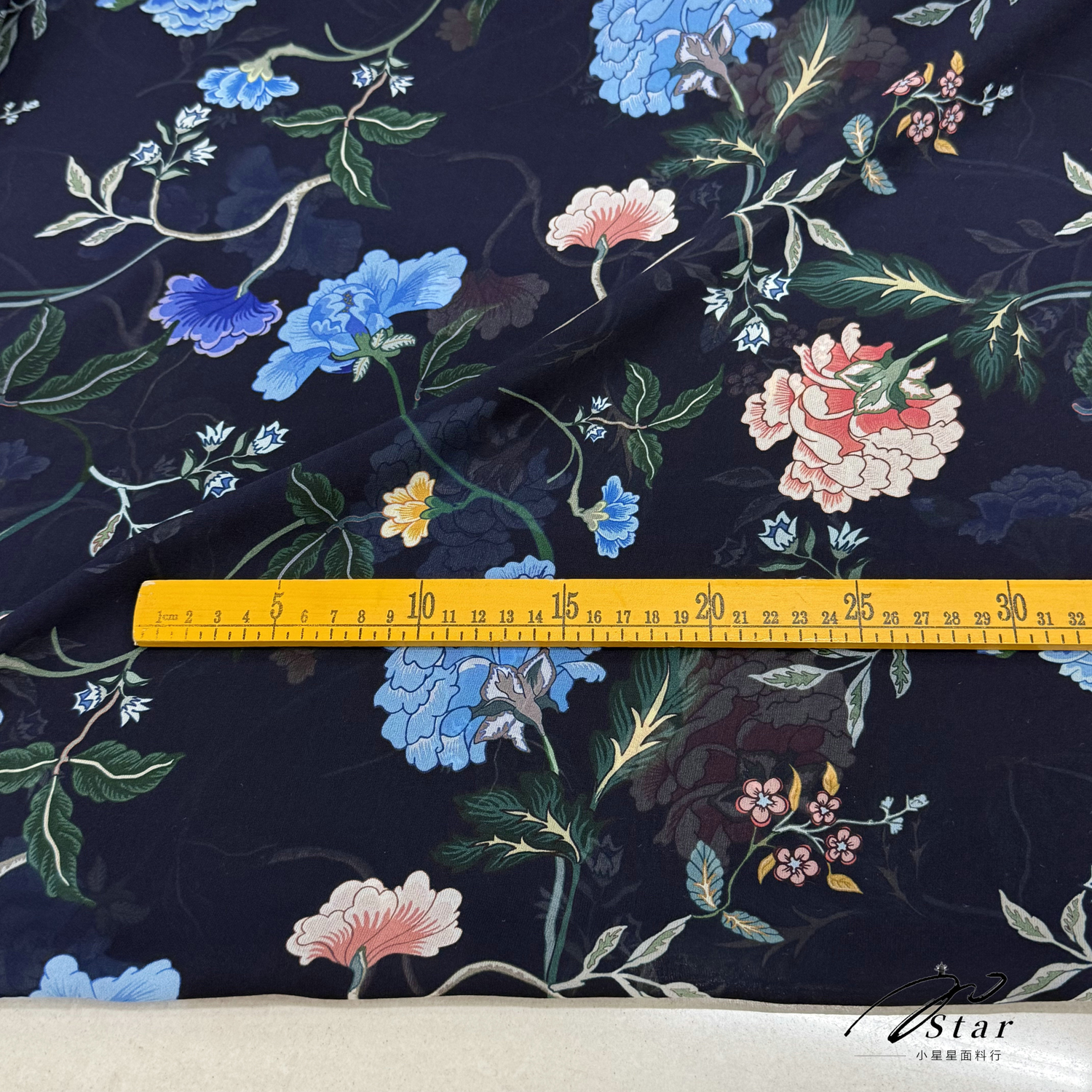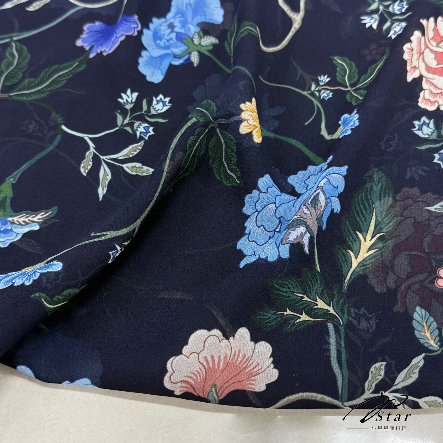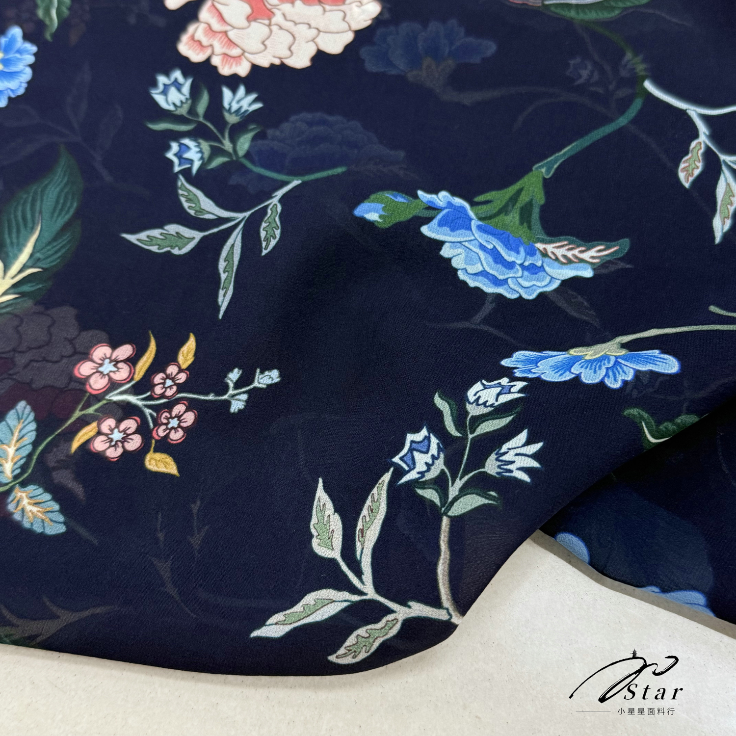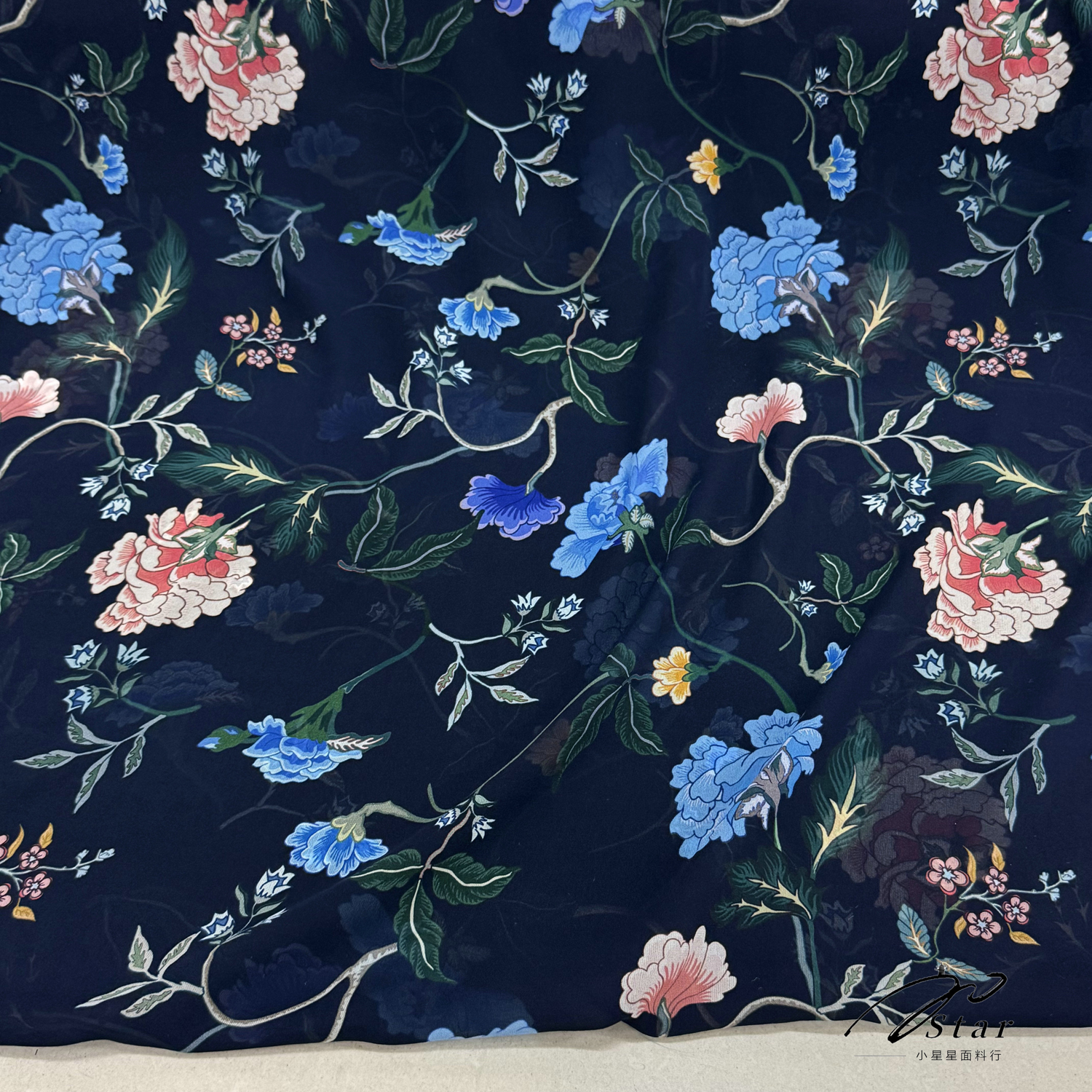 藏蓝色中国风牡丹印花真丝乔其纱布料旗袍丝巾100%桑蚕丝绸缎面料