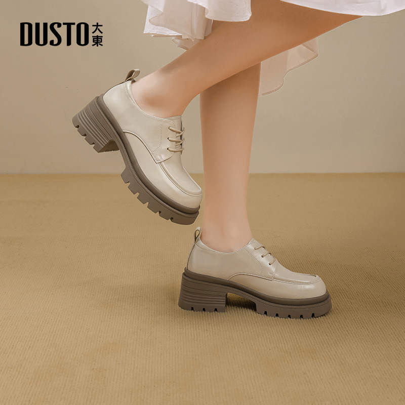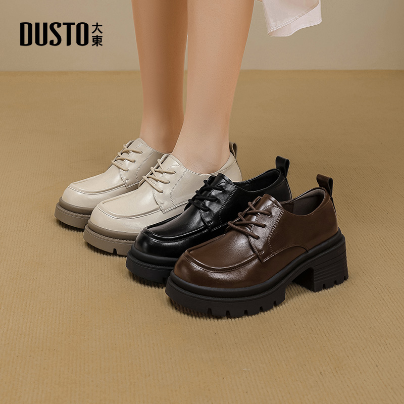 大东乐福鞋女鞋2025春秋季新款简约粗跟高跟系带圆头光板0624Z