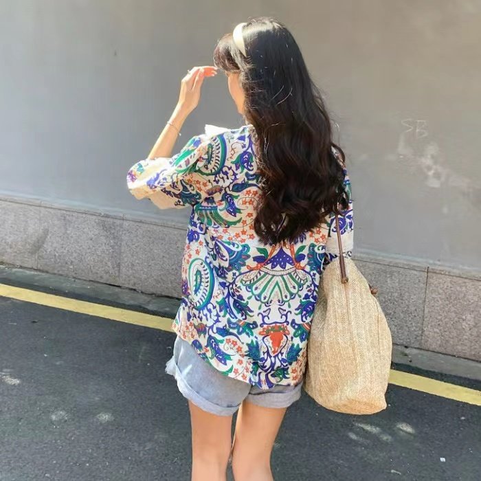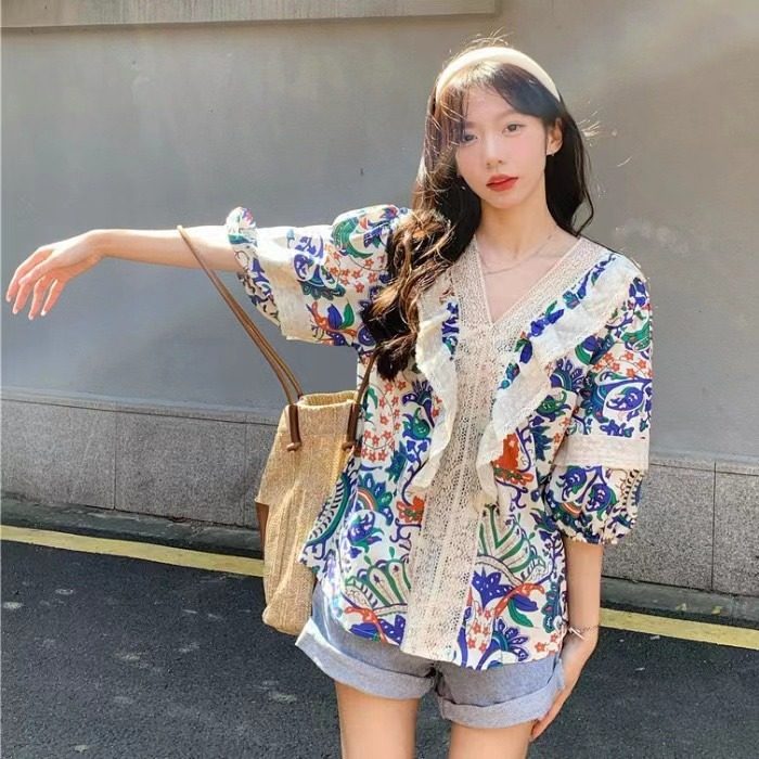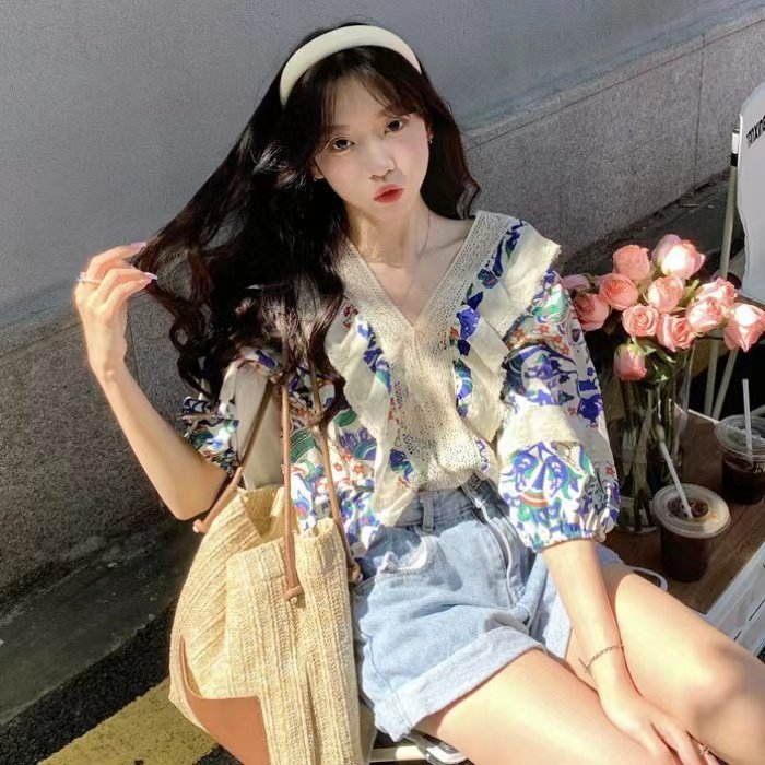 复古v领碎花衬衫女夏季韩国新款设计感小众蕾丝拼接宽松开衫上衣