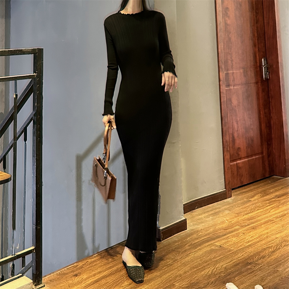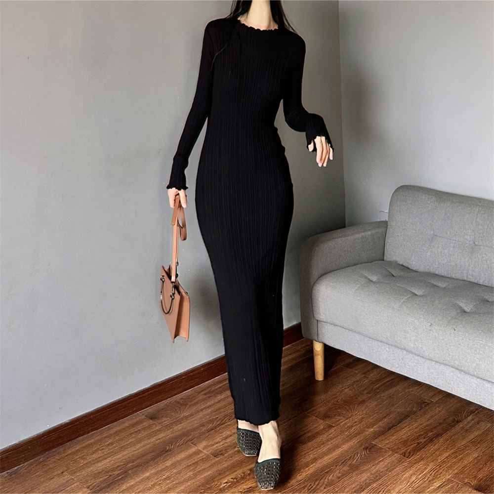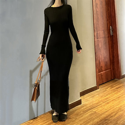 读衣术 木耳边弹力针织连衣裙法式修身包臀长裙薄加长内搭打底裙