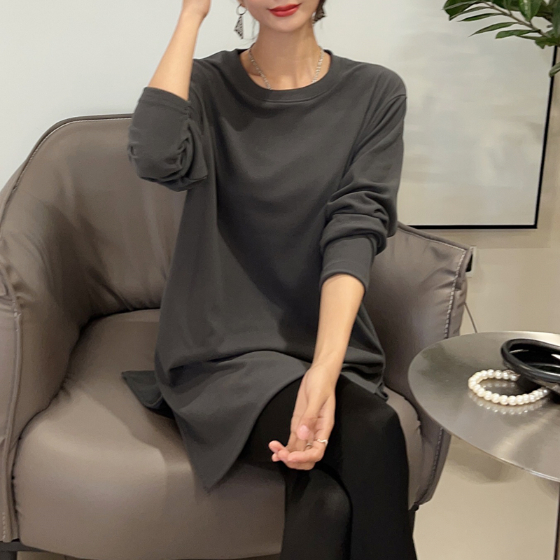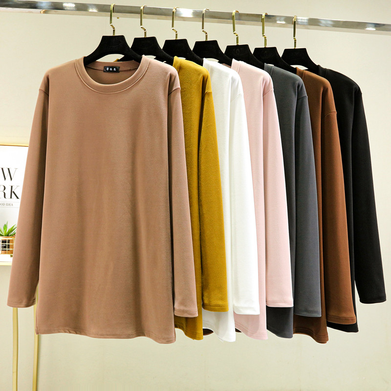 德绒宽松中长款T恤女士打底衫秋冬圆领长袖内搭加绒加厚保暖上衣