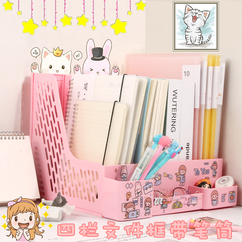 加厚文件架资料框收纳盒书立架办公用品档案筐文件夹子多层桌面塑料书架简易桌上文件框资料架粉色置物架