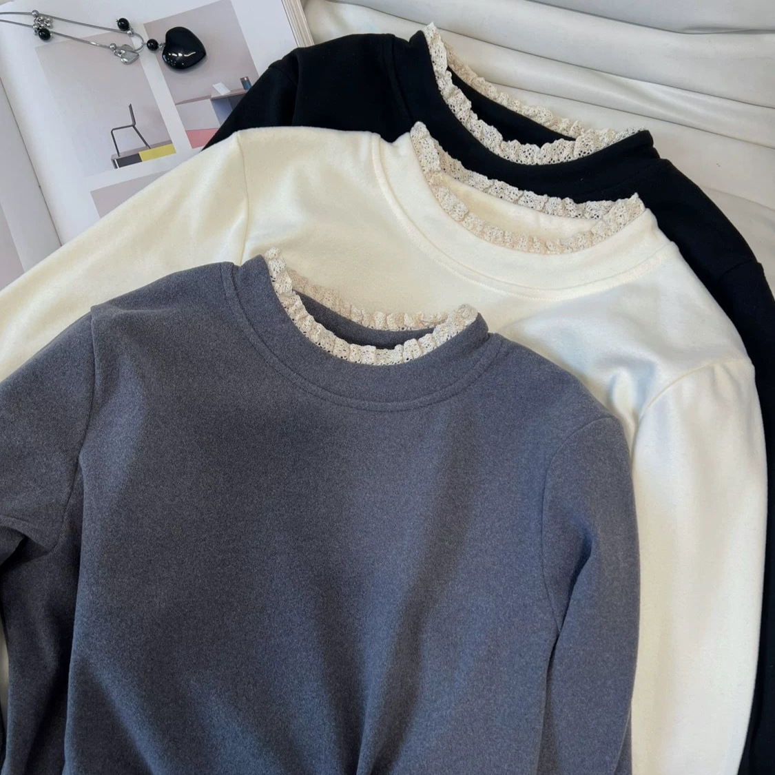 日系温柔复古蕾丝花边德绒长袖打底衫 秋冬季加厚磨毛内搭T恤衫