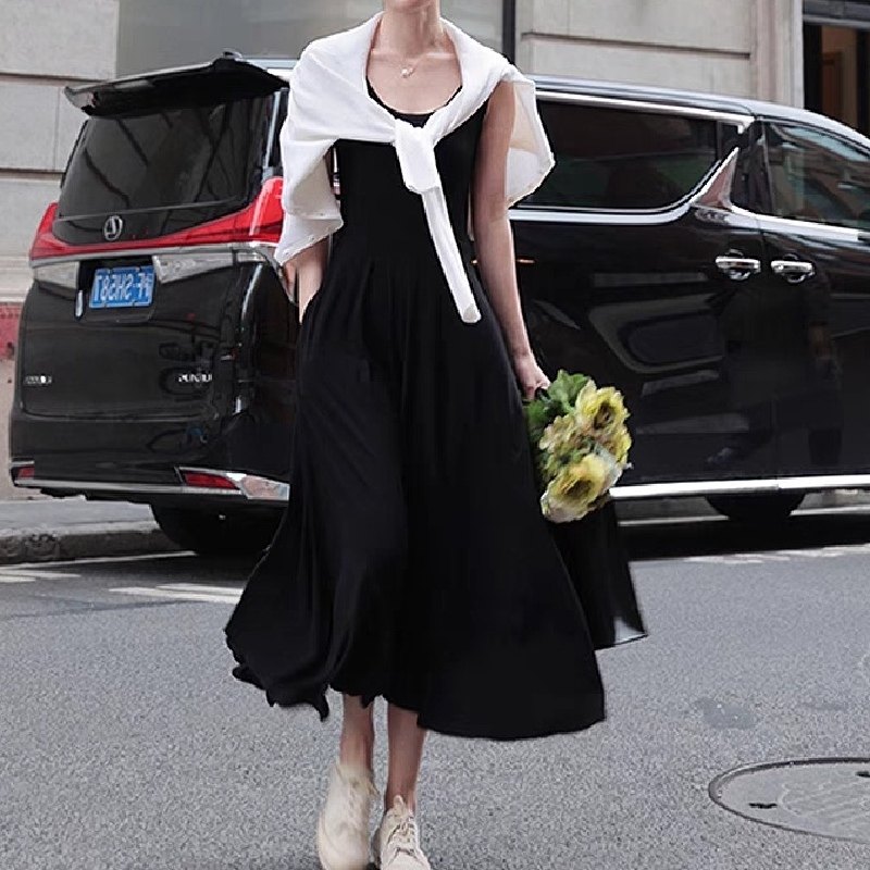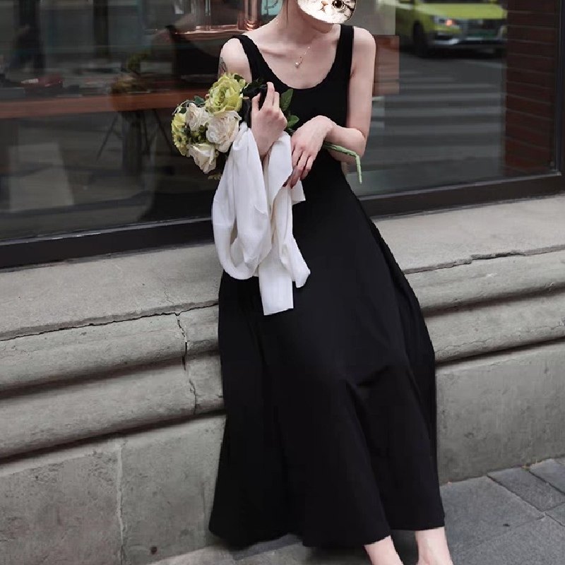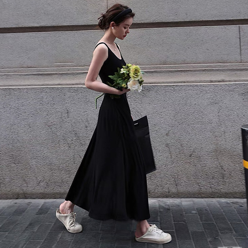 吊带打底连衣裙法式黑色女大码小黑裙打底莫代尔显高中长款背心裙