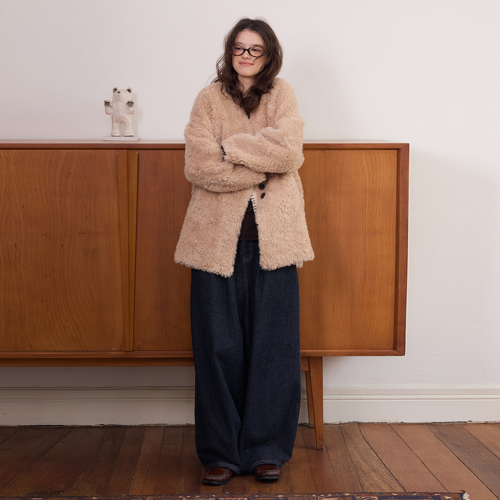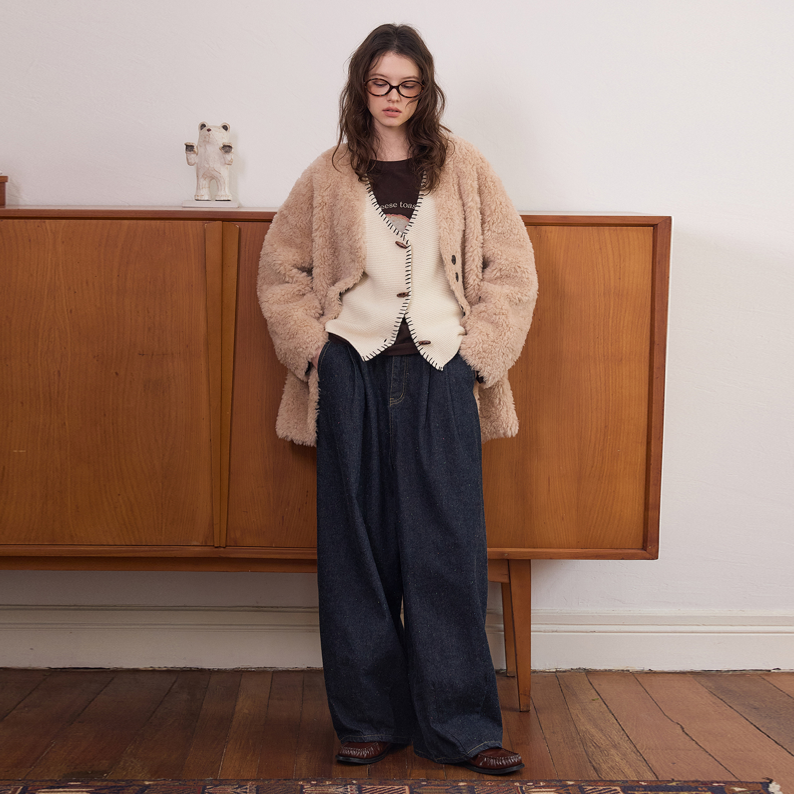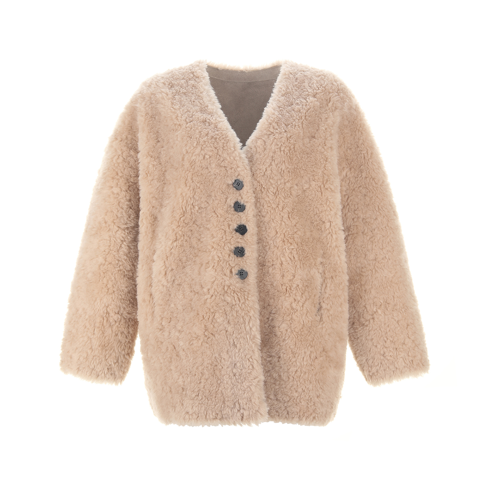【明星同款】wana tryV领绵羊毛环保皮草卡其色大衣冬新款外套女