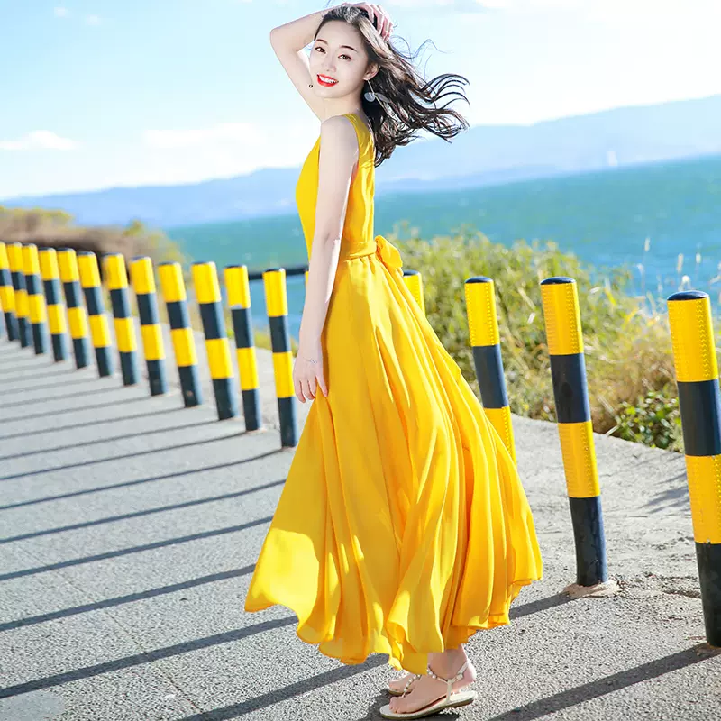 2024黄色气质女装早春夏沙滩裙高级感水墨画背心长裙子雪纺连衣裙