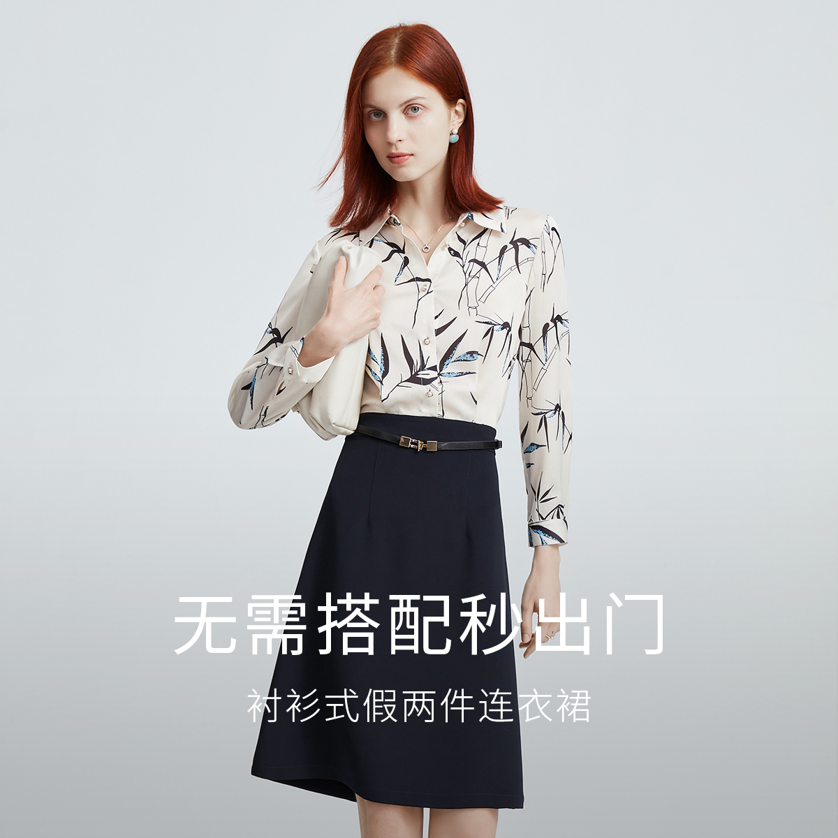 菲妮迪衬衫连衣裙2025秋新款假两件拼接减龄显瘦气质印花裙子女
