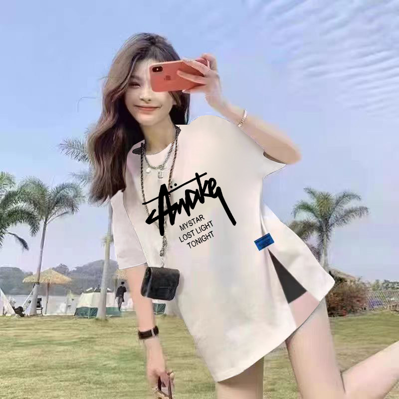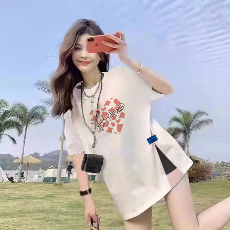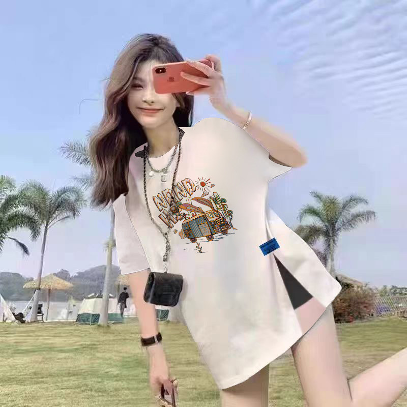 纯棉白色2025女夏季新款遮屁股短袖t恤宽松中长款开叉上衣女ins潮