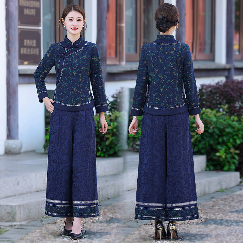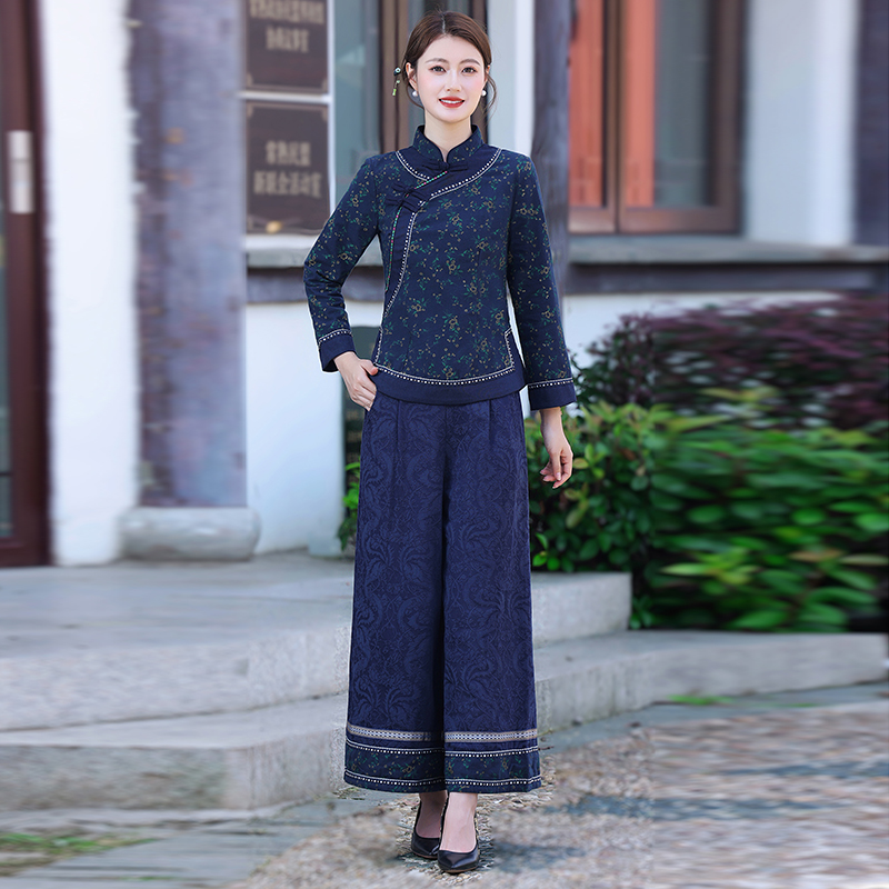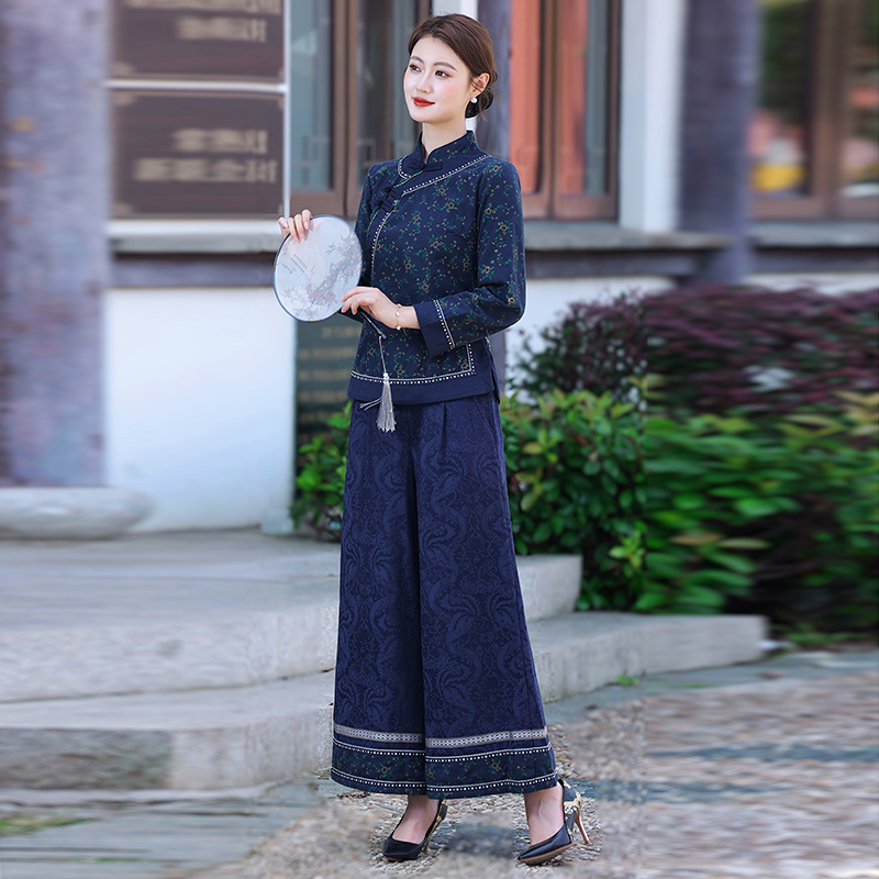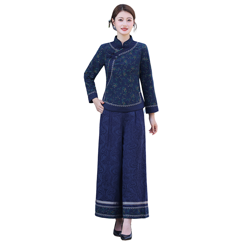 秋冬民族风棉麻印花大码新中式拼接显瘦茶服衬衣阔腿裤两件套装女