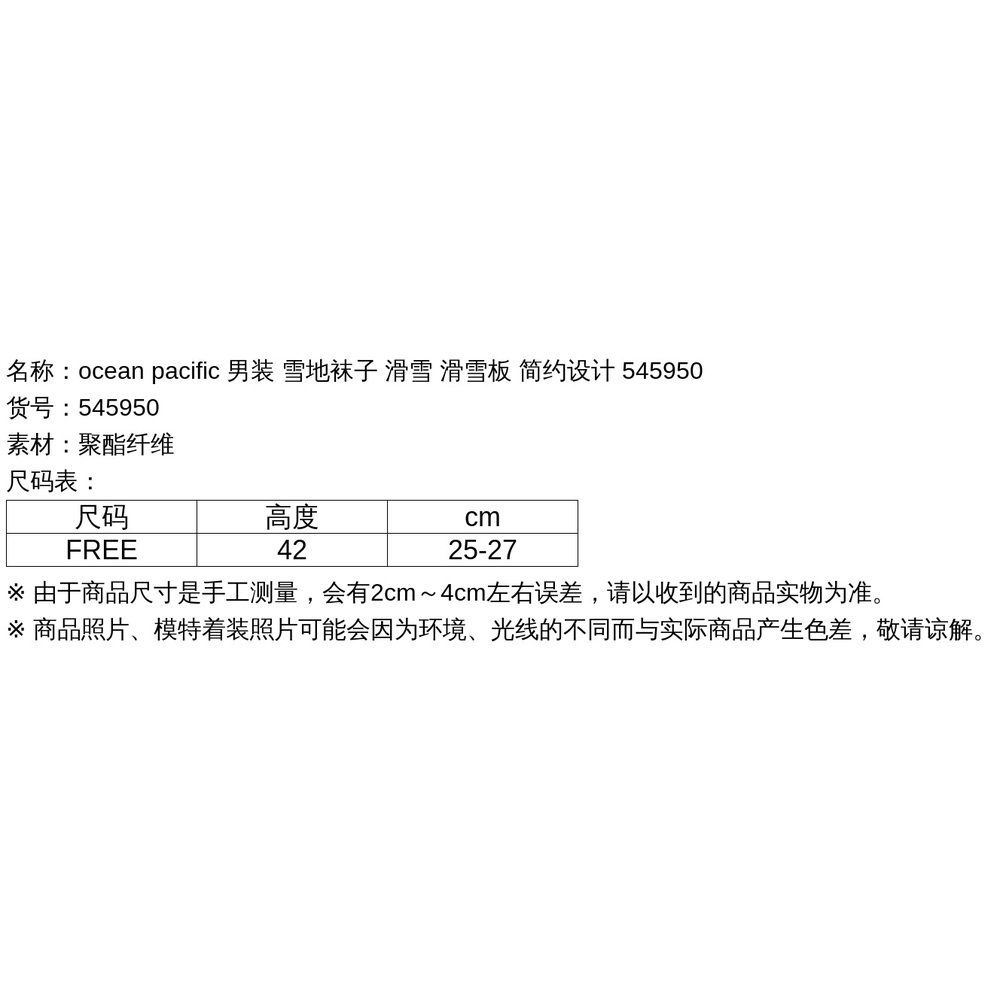 1h可退 日本直邮ocean pacific 男装 雪地袜子 滑雪 滑雪板 简约