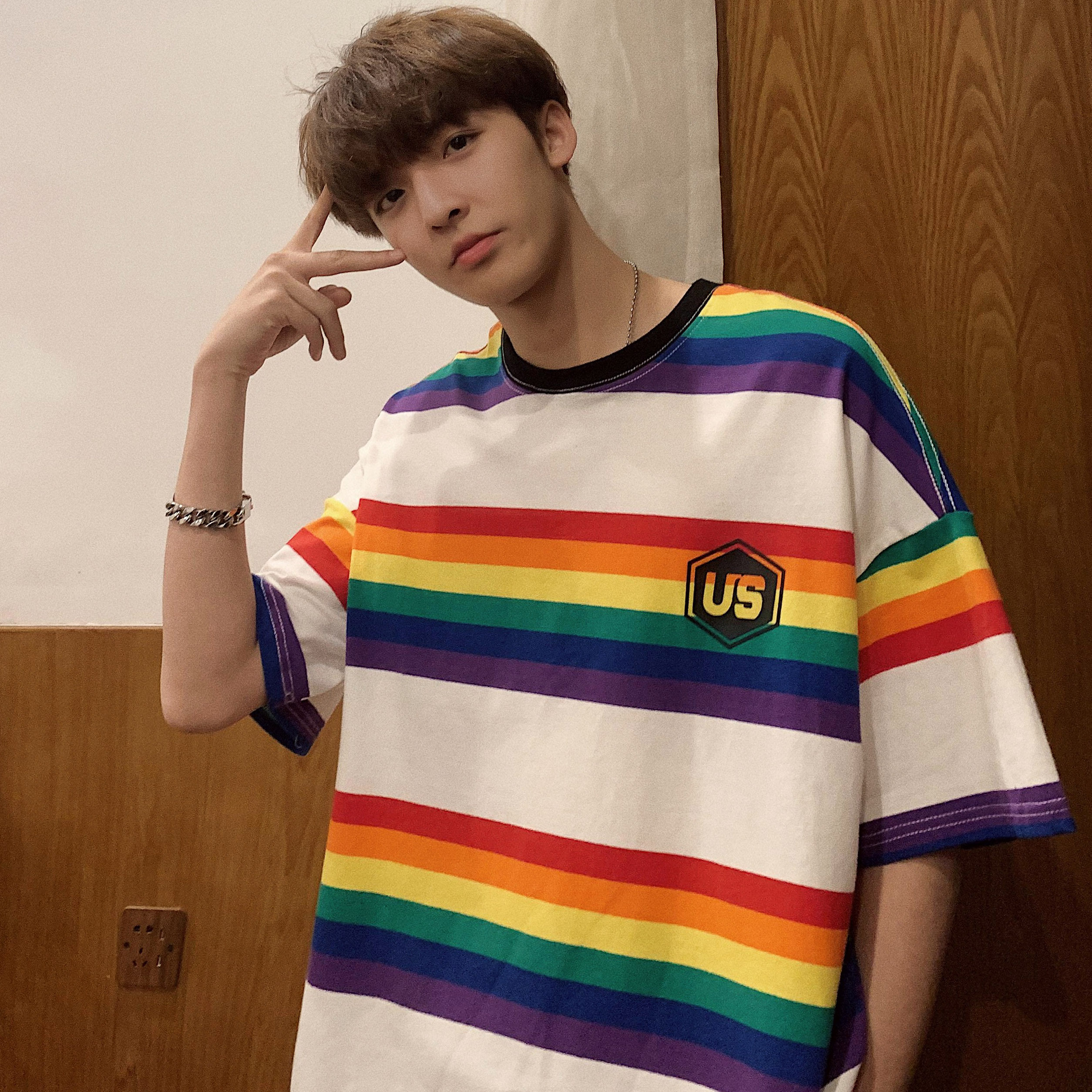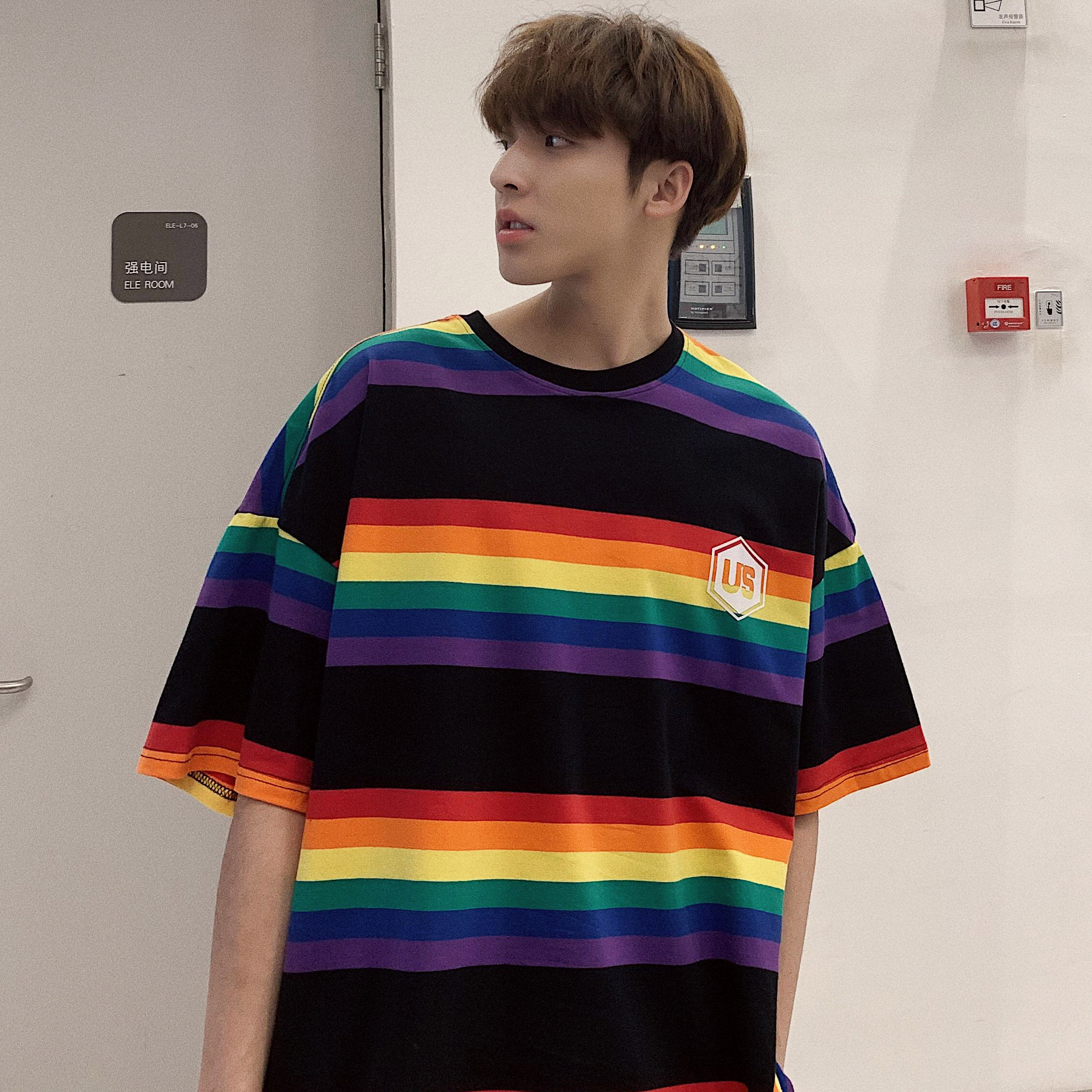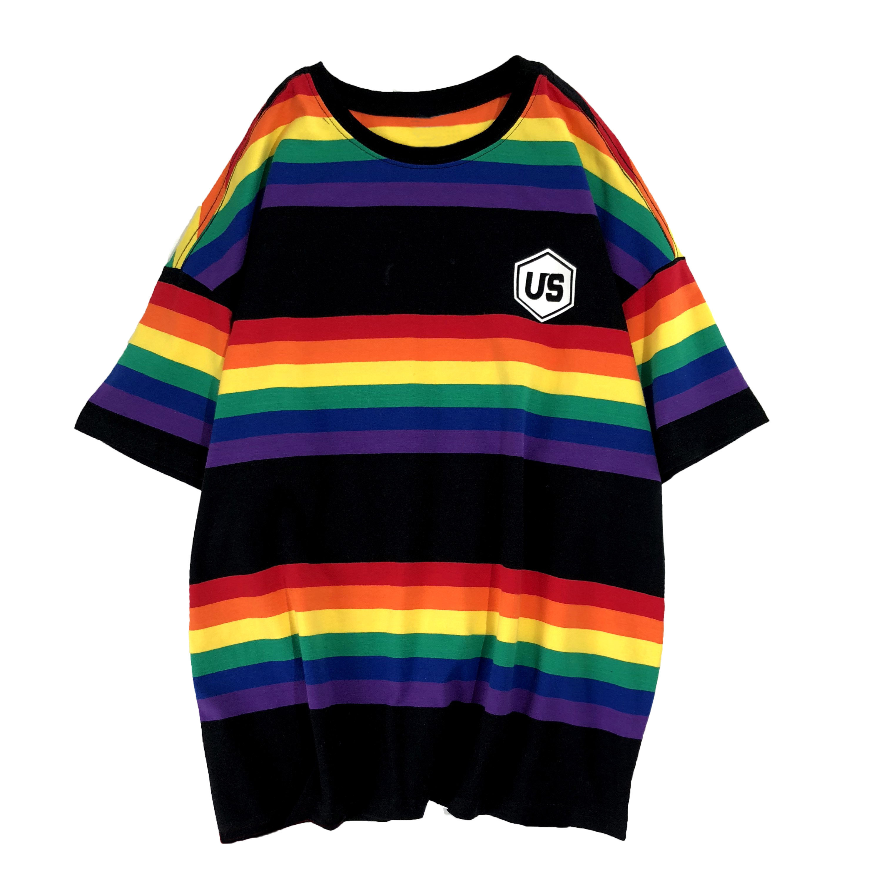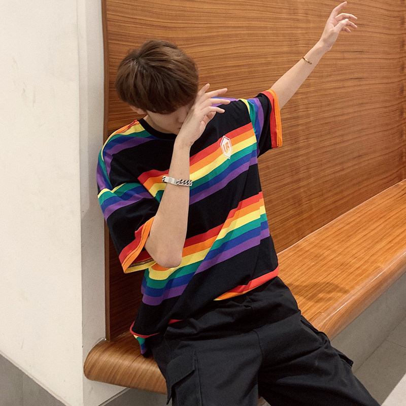 彩虹条纹短袖T恤男宽松