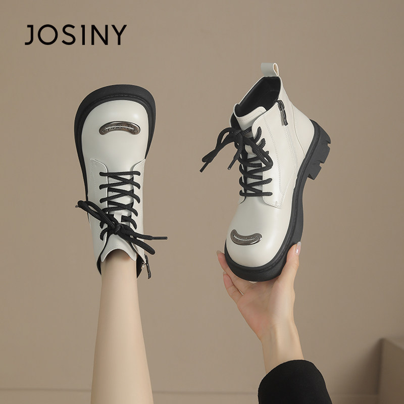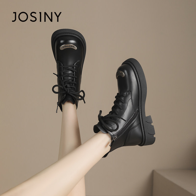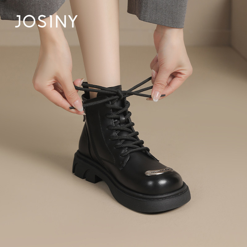 卓诗尼2025秋冬季新款厚底马丁靴女靴子系带短靴单里加绒圆头平底
