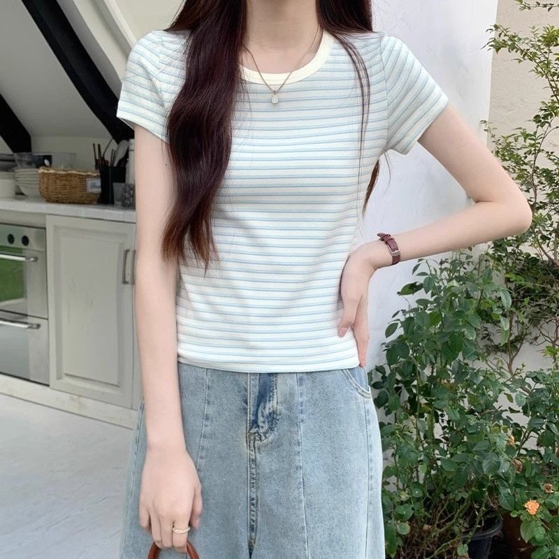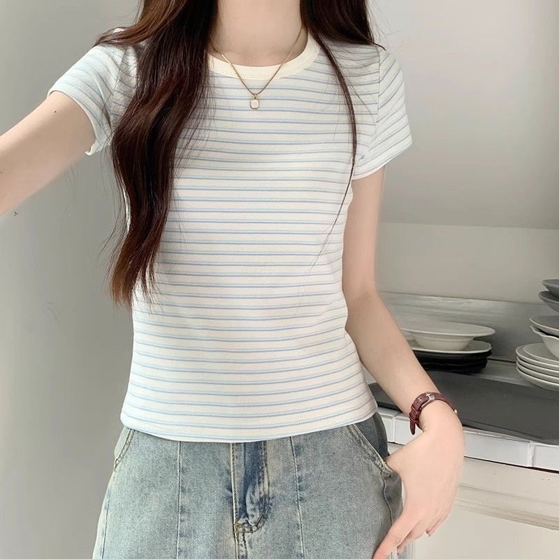 2025新款网红简约蓝白条纹短袖T恤女夏季洋气减龄圆领显瘦上衣女