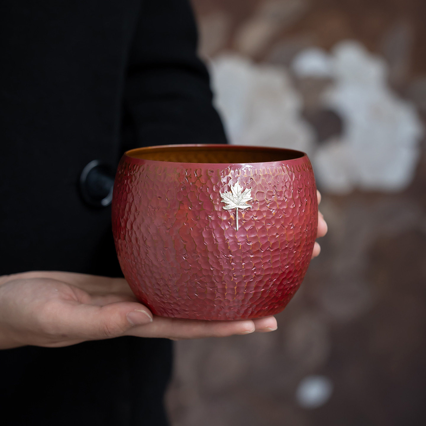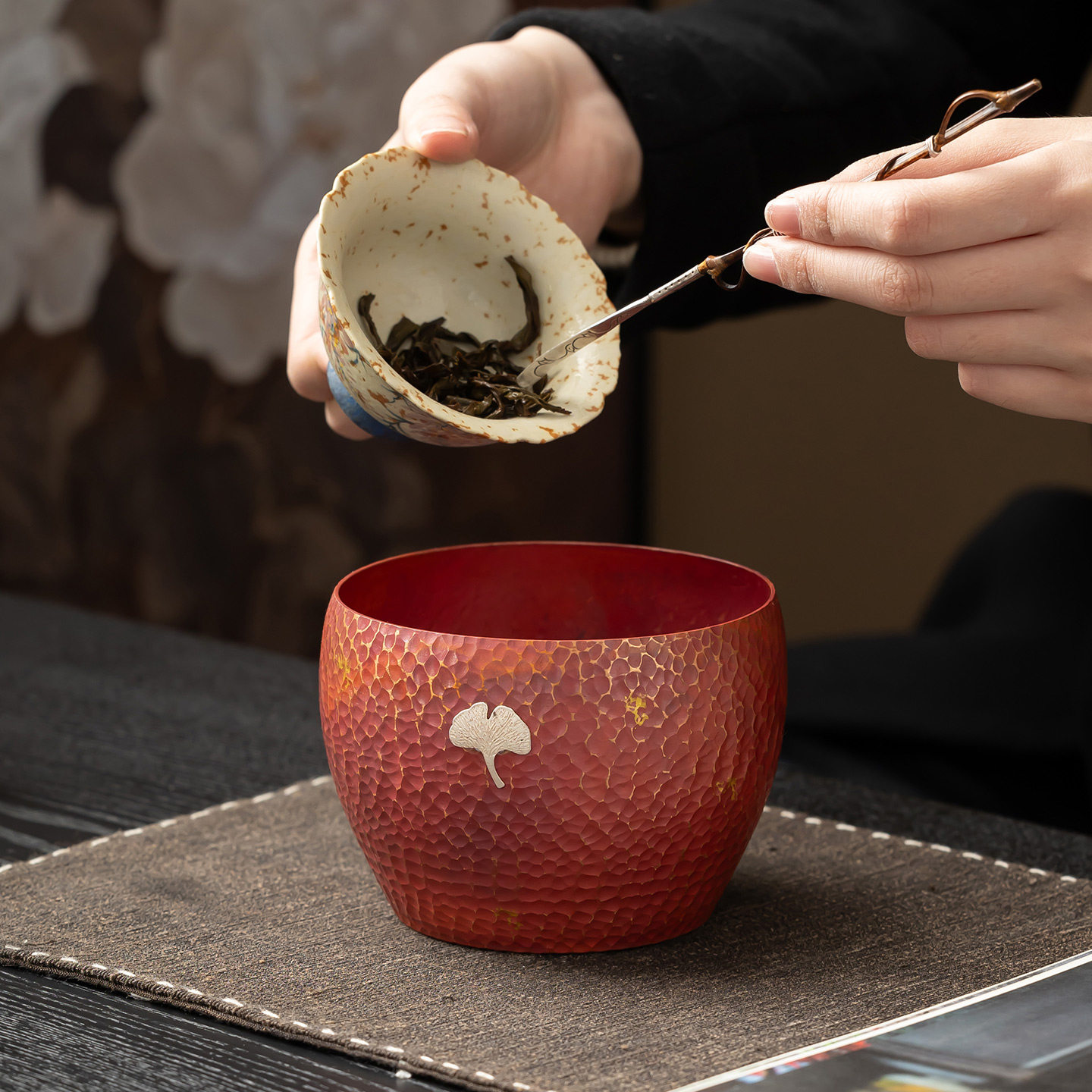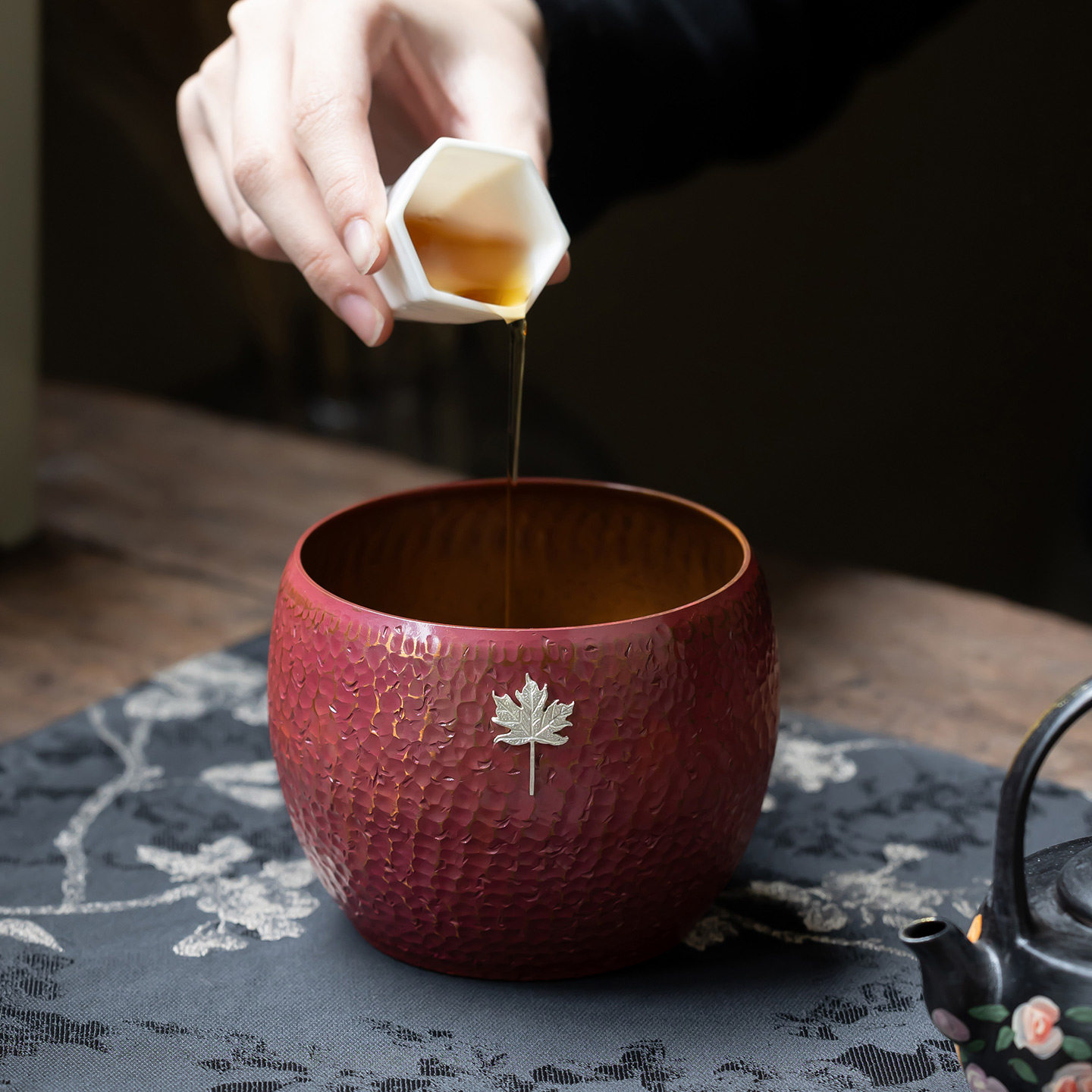 紫铜锤纹嵌枫叶杏叶建水茶洗杯洗功夫茶具茶道配件干泡水盂茶渣缸