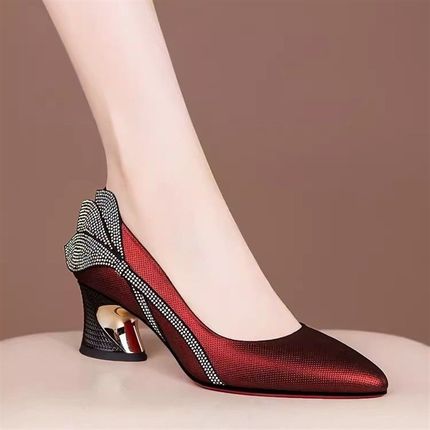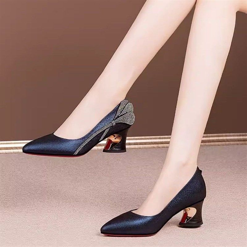水钻真皮尖头浅口粗跟单鞋女中跟鞋2024春秋新款时尚百搭大码女鞋