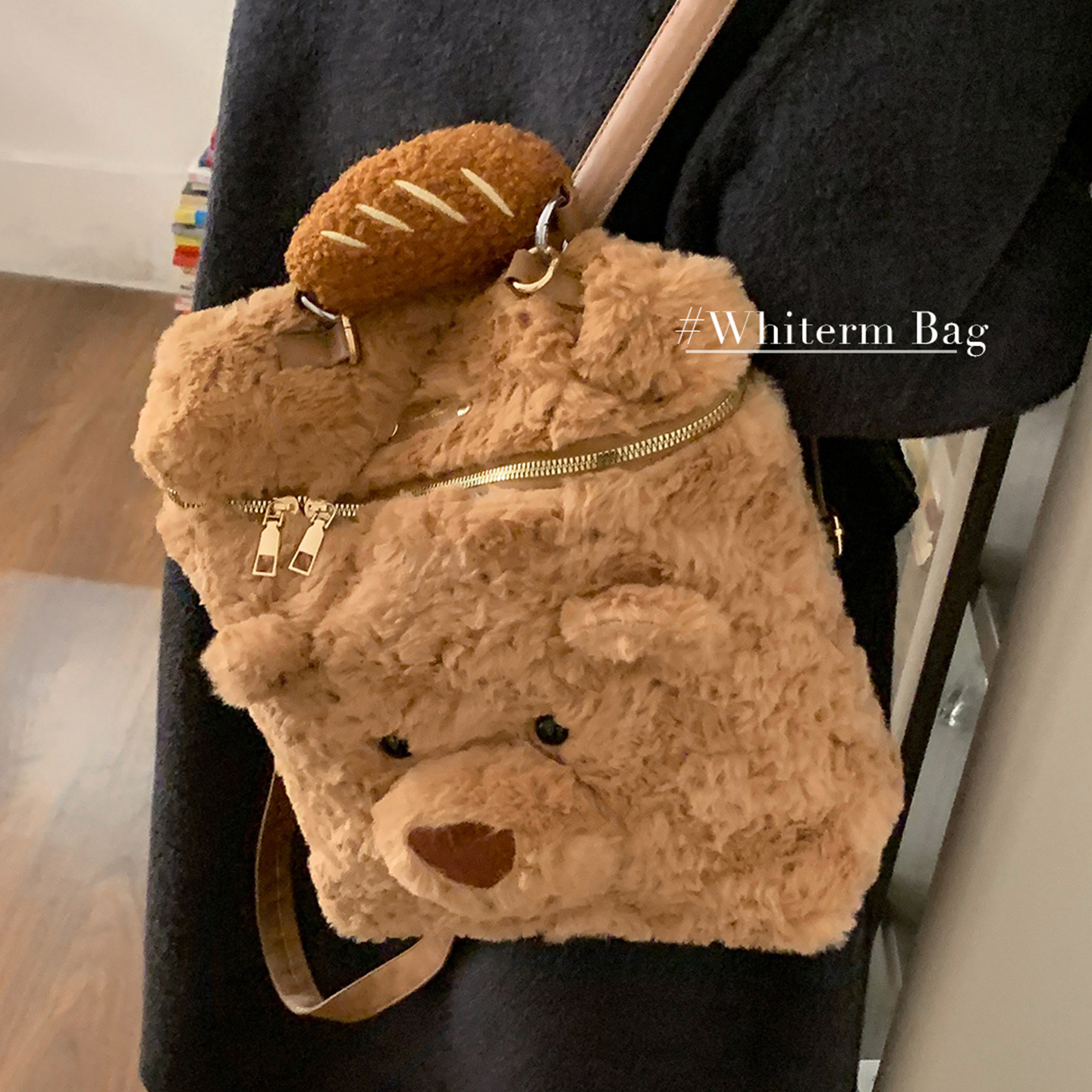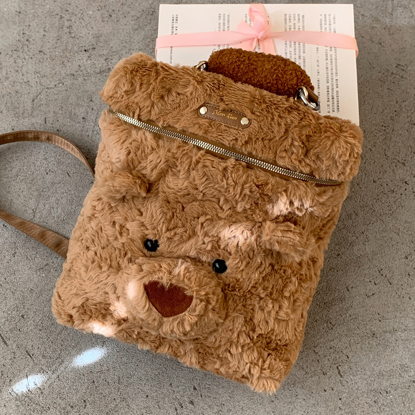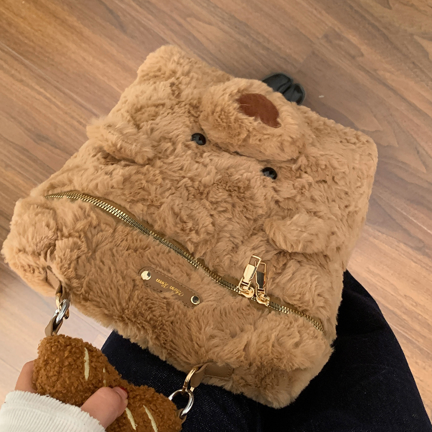 可爱小熊双肩包毛毛包女2025冬季新款毛绒背包卡通大容量手提包包
