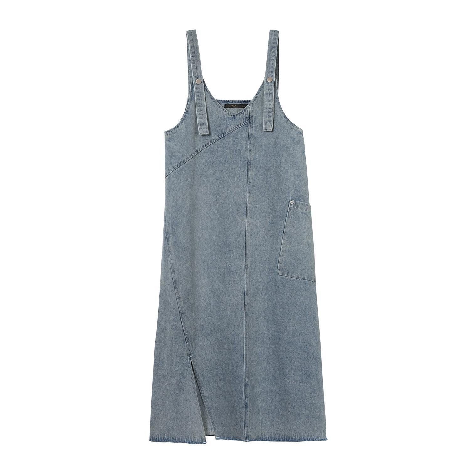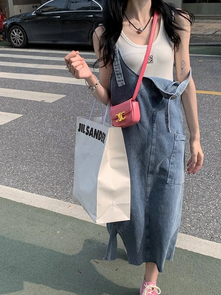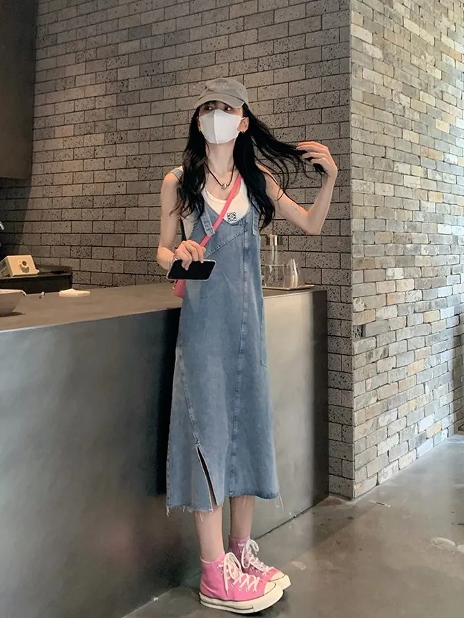 可盐可甜牛仔背带裙女小个子中长款连衣裙复古宽松开叉减龄吊带裙
