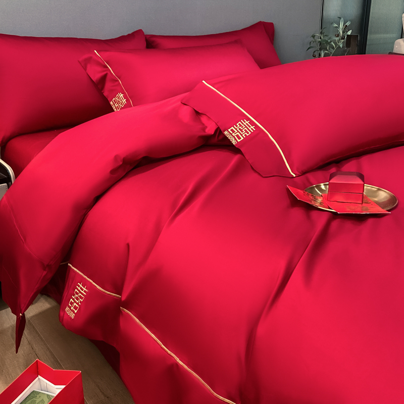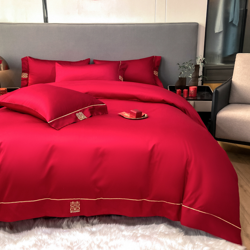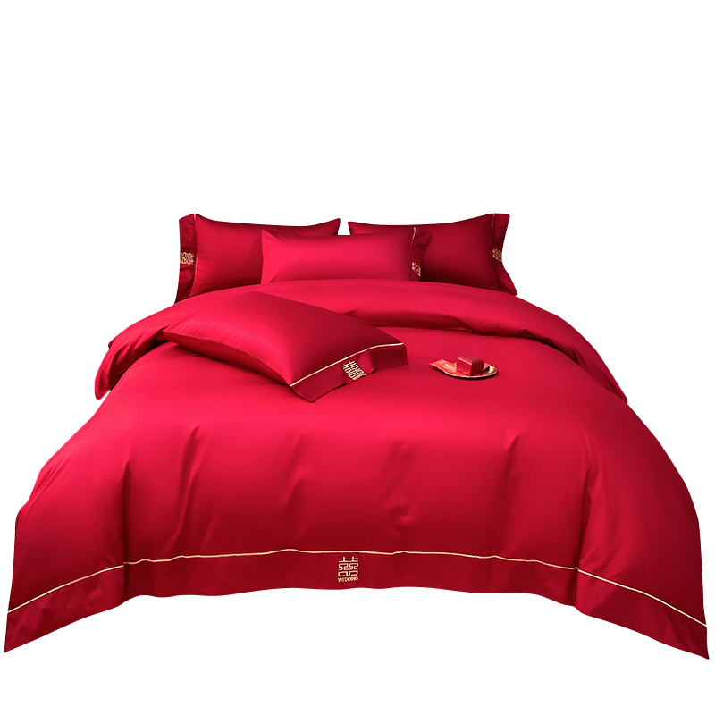 简约婚庆四件套大红色结婚喜字刺绣全棉纯棉被套床单喜嫁床上用品