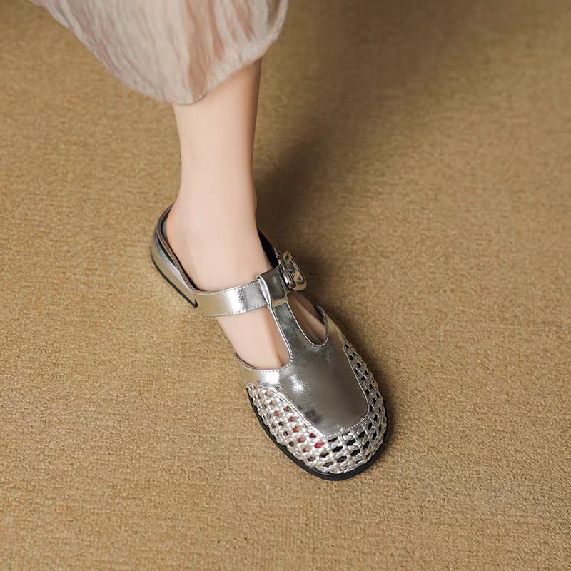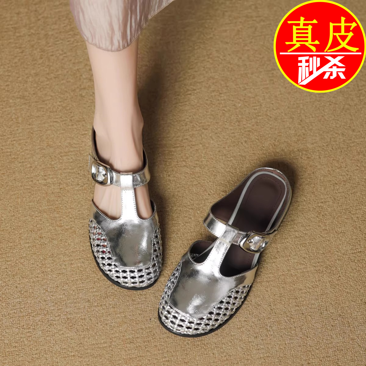 品牌撤柜法式真皮镂空编织包头半拖鞋女2025夏季外穿穆勒鞋凉拖女
