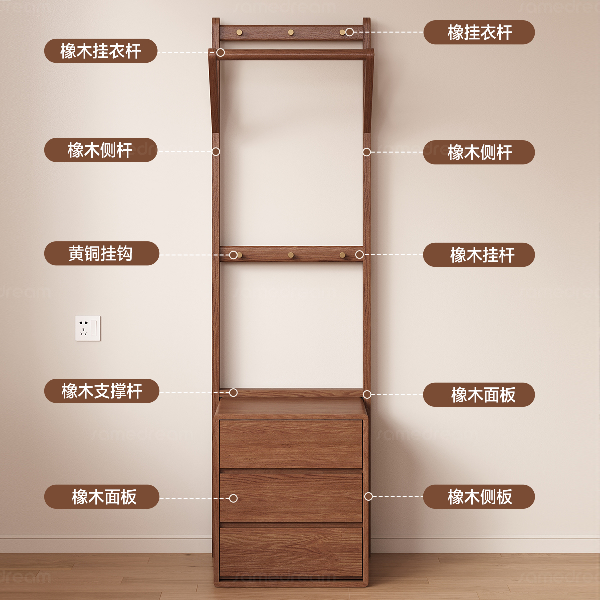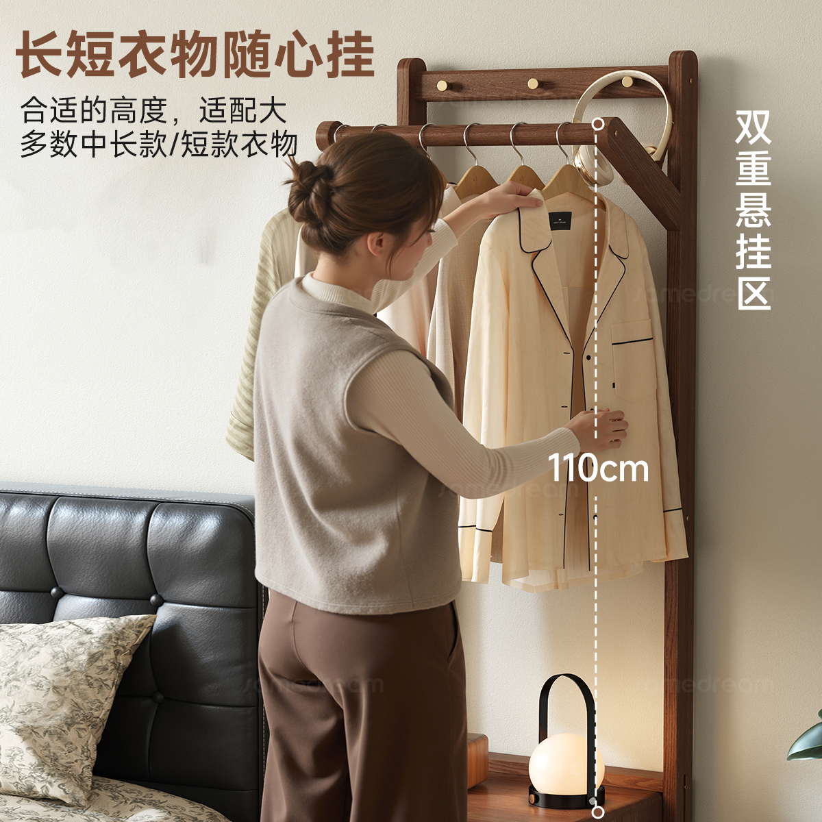 三梦实木床头柜衣帽架一体卧室床边收纳挂衣架落地多功能置物架
