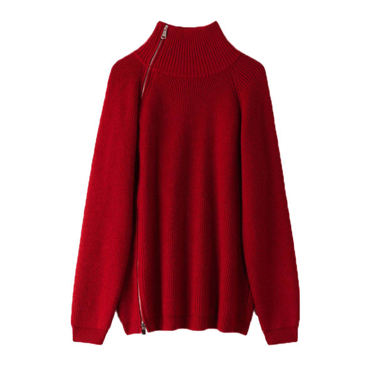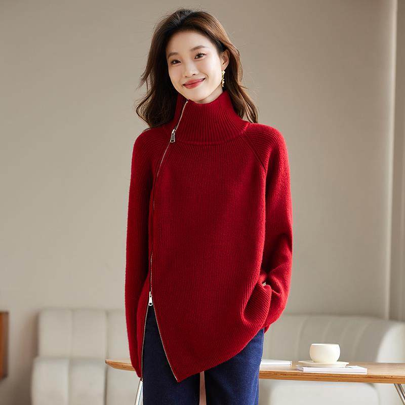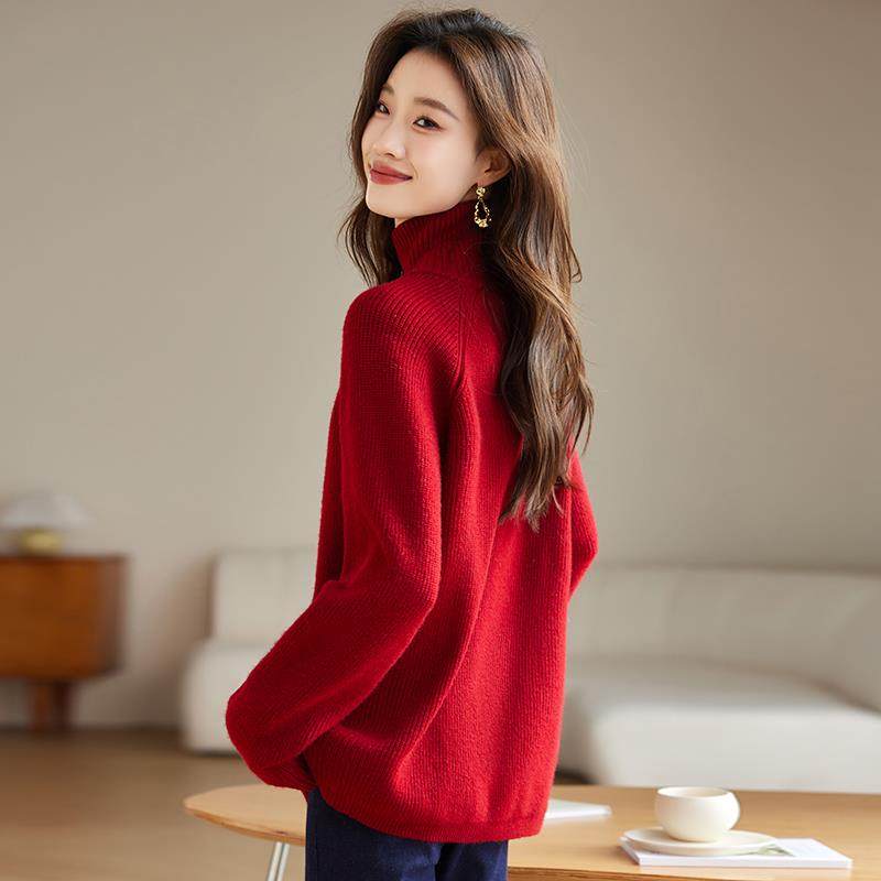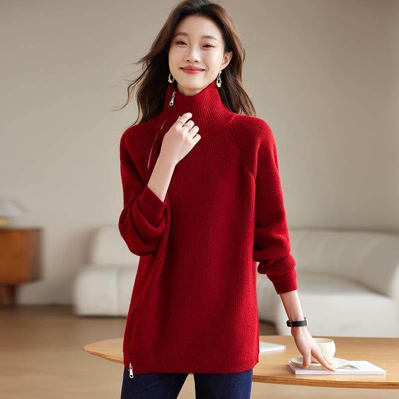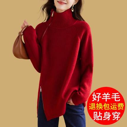 秋冬季加厚双拉链高领宽松慵懒风红色中长款毛衣女装超好看羊毛衫