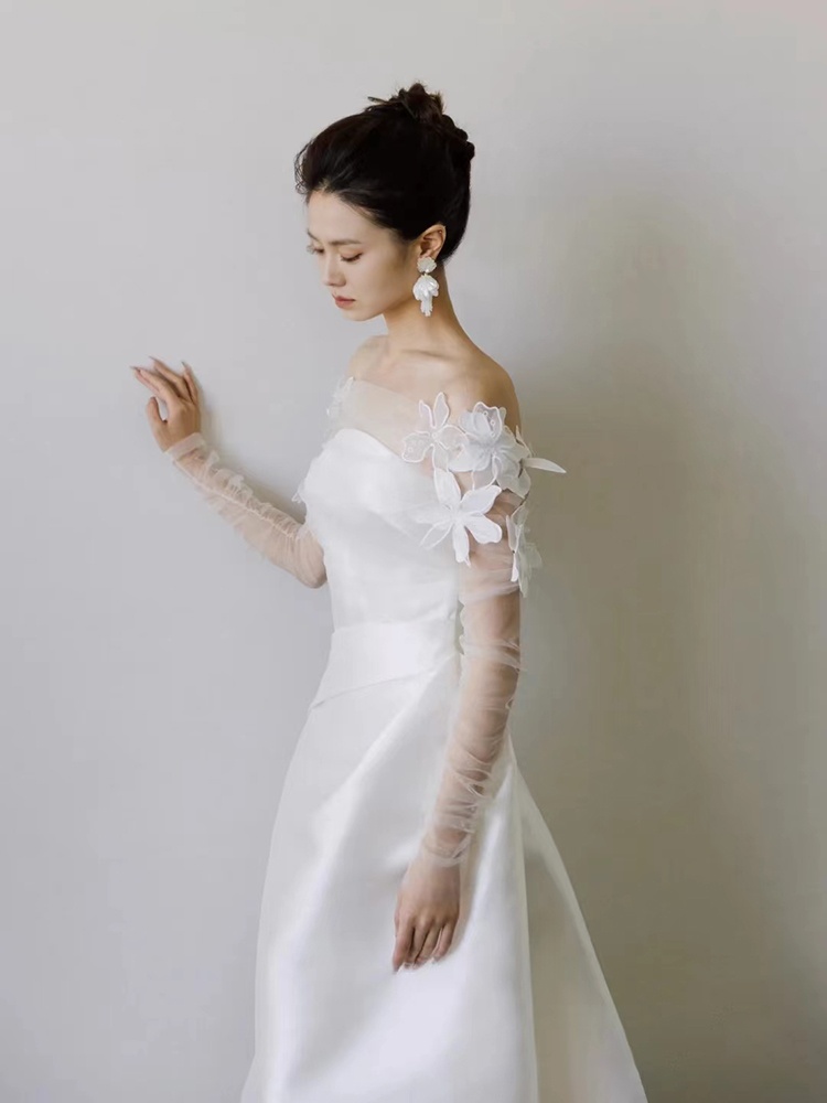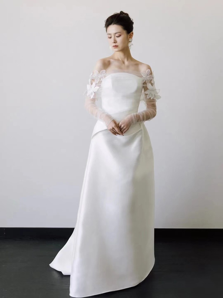 梵娜仙衣缎面一字肩轻婚纱新娘迎宾出门纱白色简约礼服森系超仙