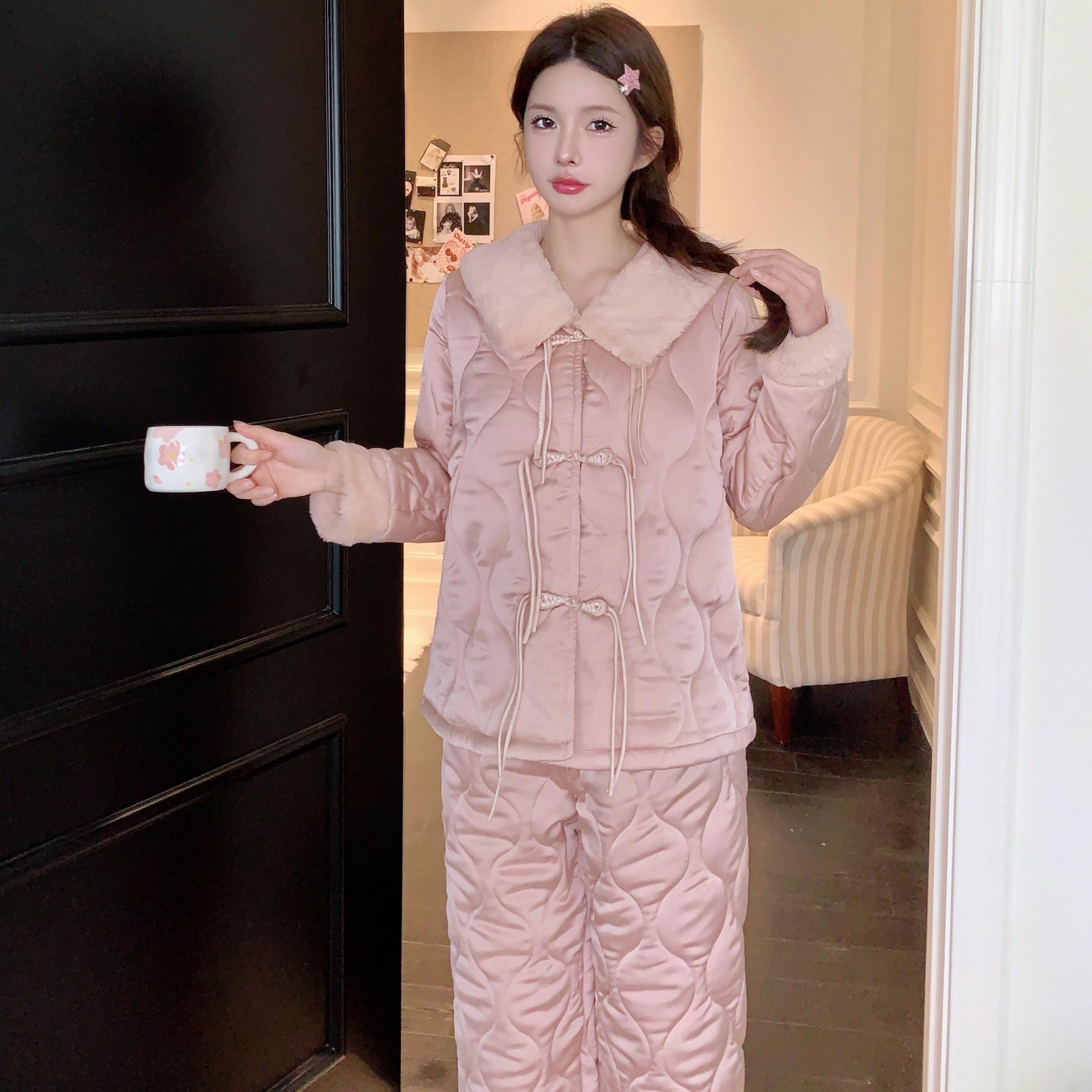 珊瑚绒睡衣女三层夹棉加厚加绒国风毛毛领女款冬季气质家居服套装