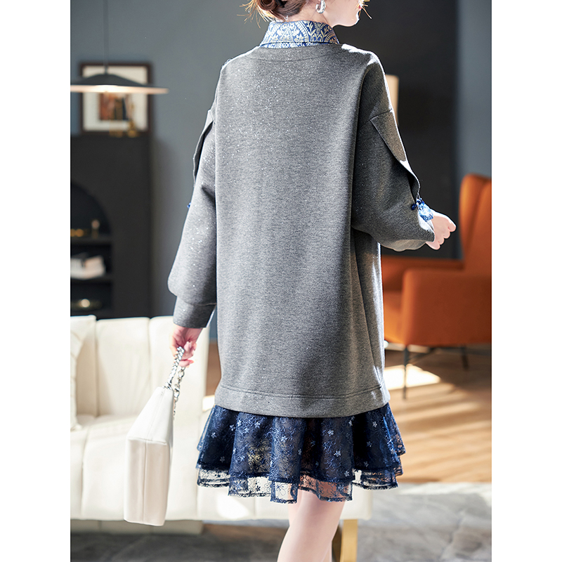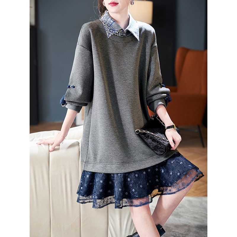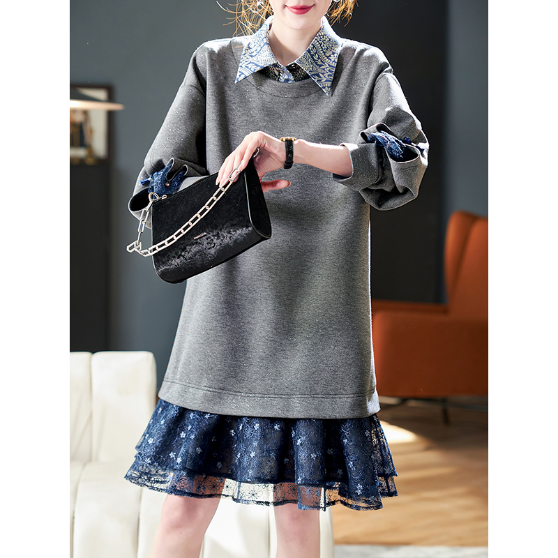 宝诗黎假两件拼接亮丝连衣裙女2025秋季新款气质设计感长袖中长裙