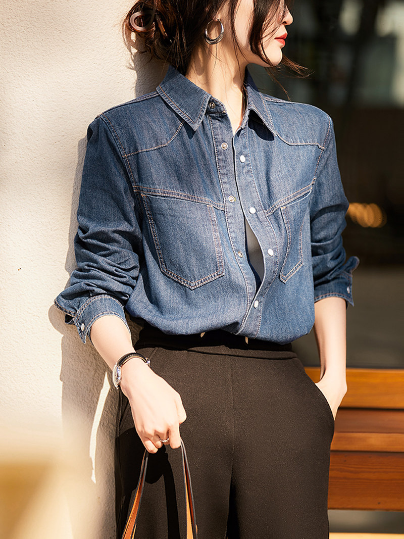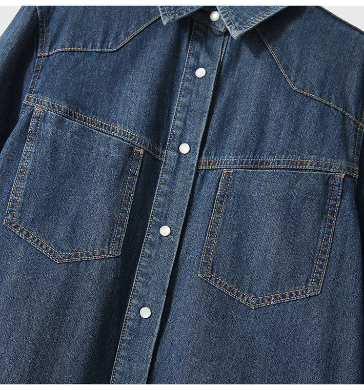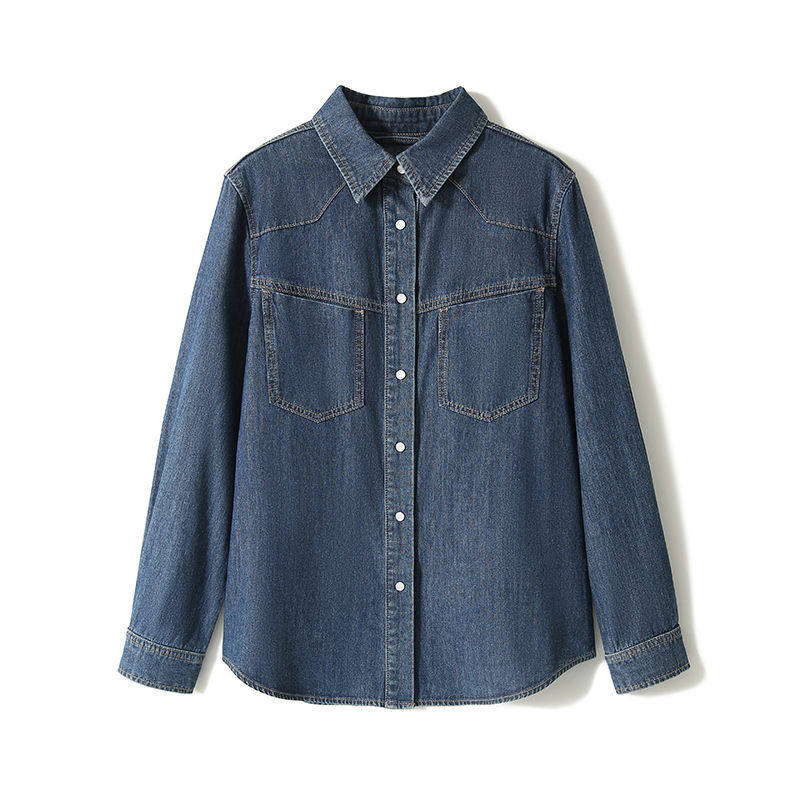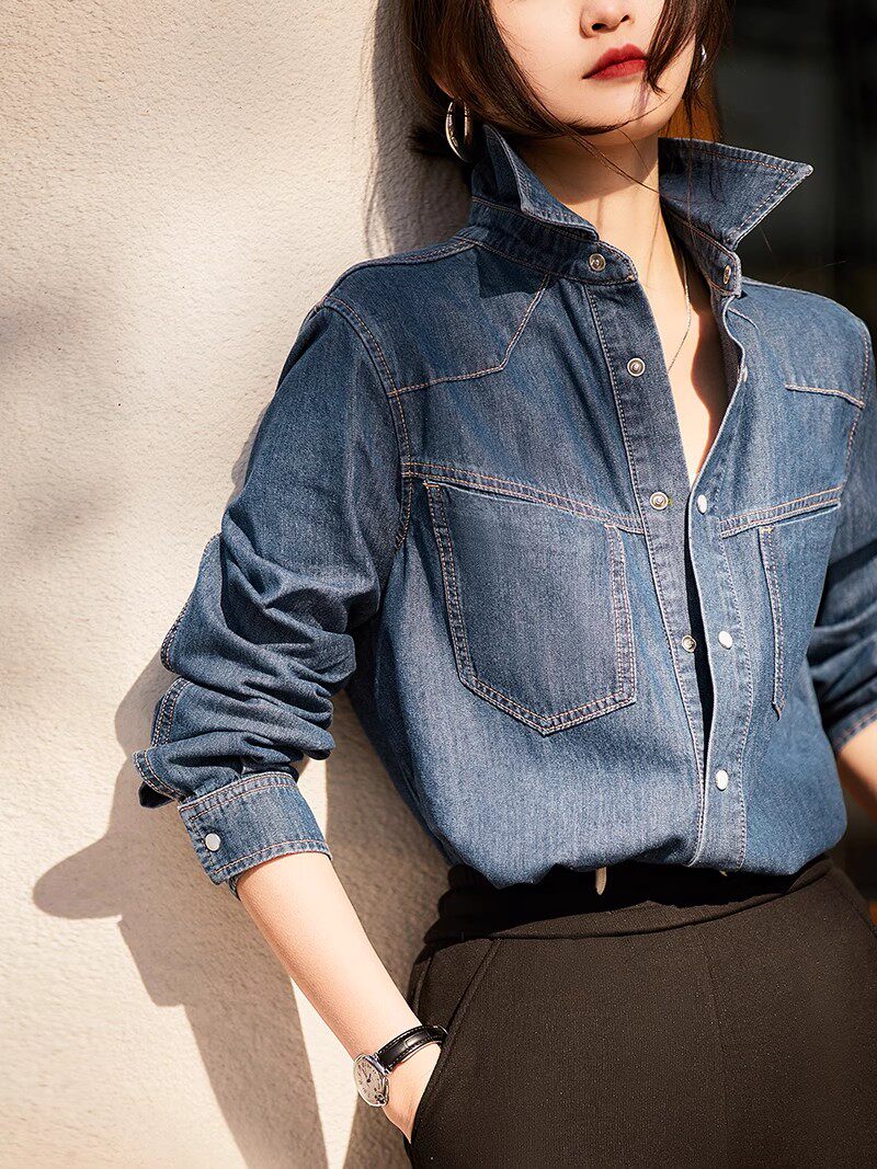 复古加绒水洗牛仔衬衫女春秋新款时髦设计高级感长袖叠穿衬衣外套
