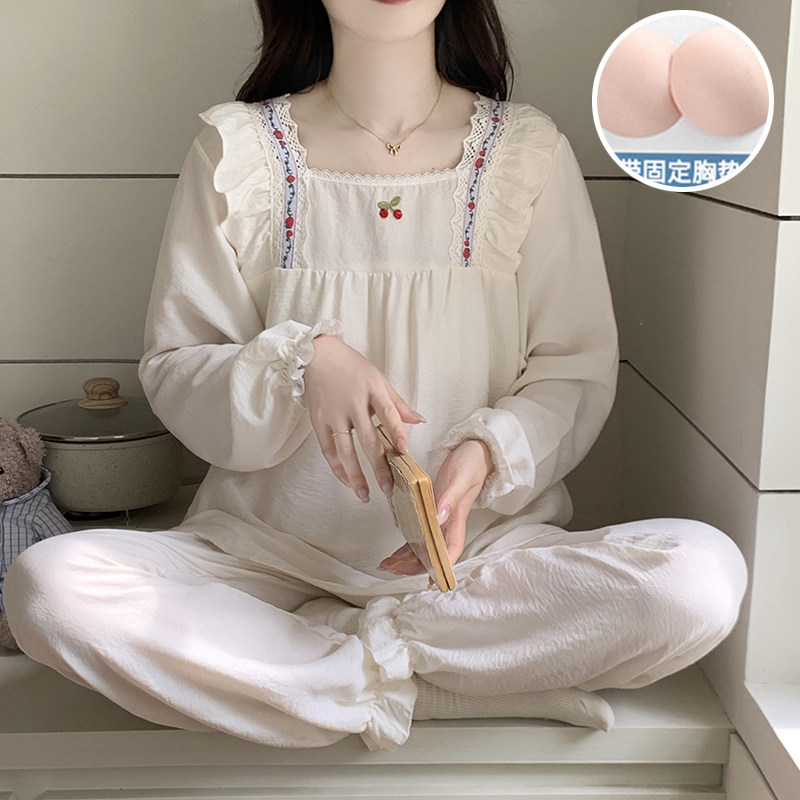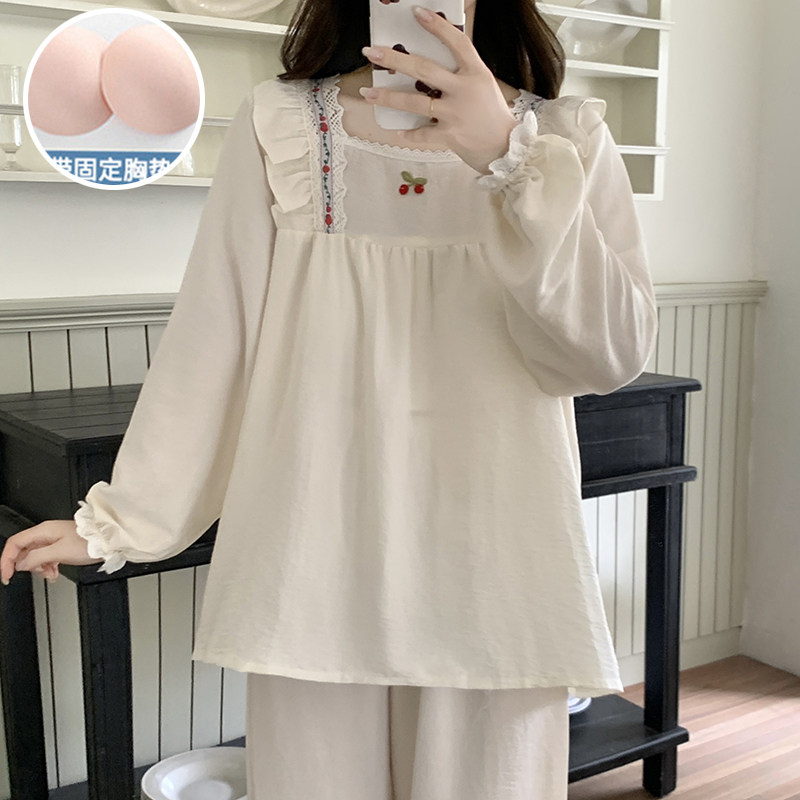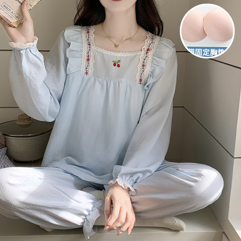 春秋季睡衣女款带胸垫一体可外穿甜美长袖宽松套装云朵棉绸家居服