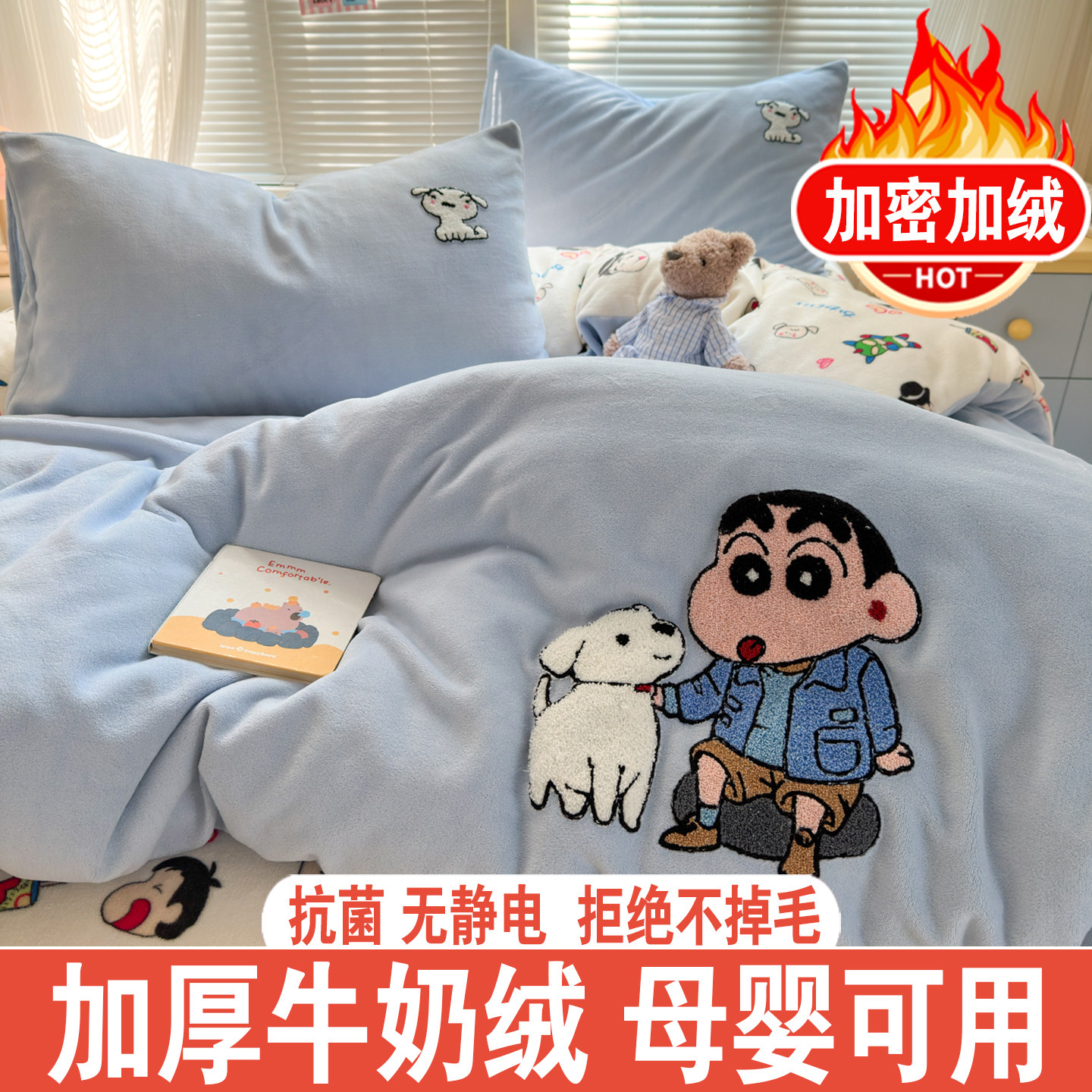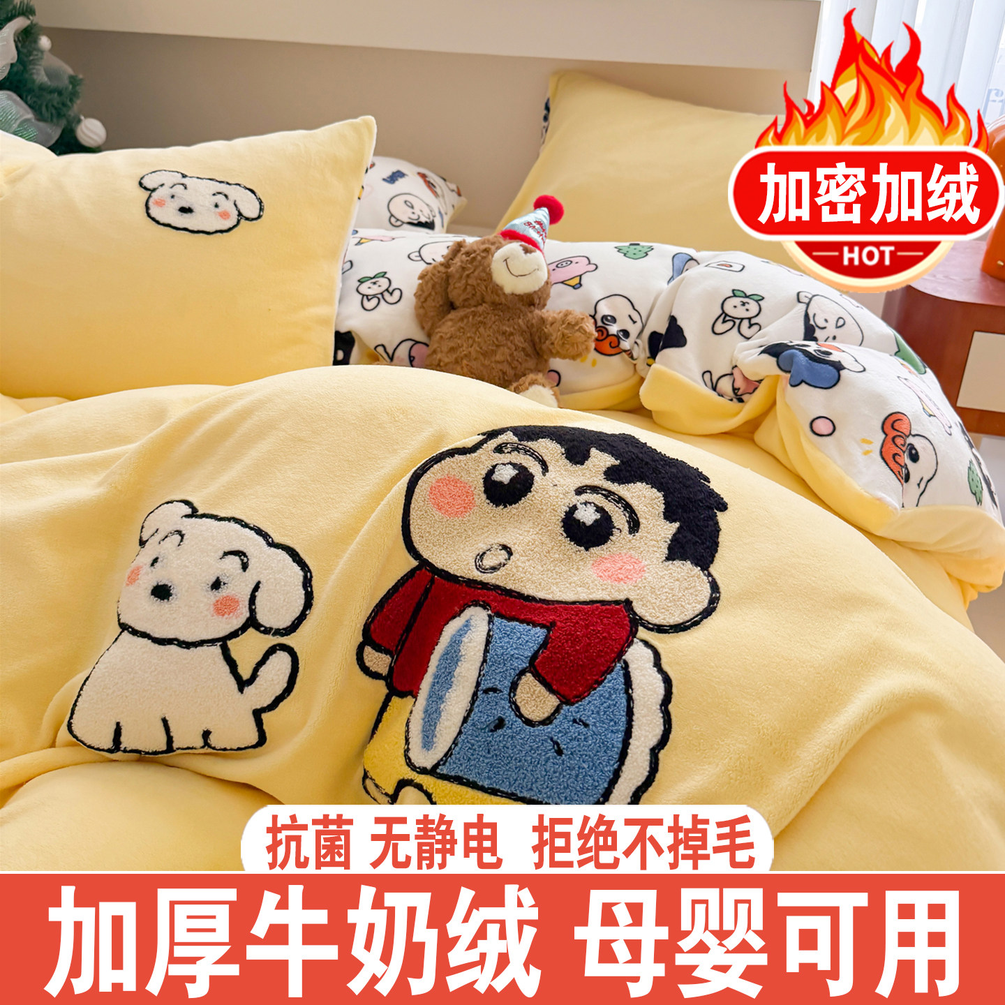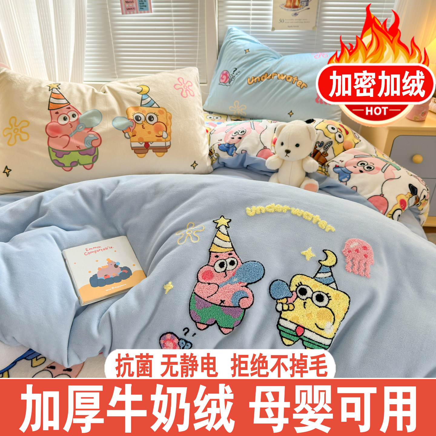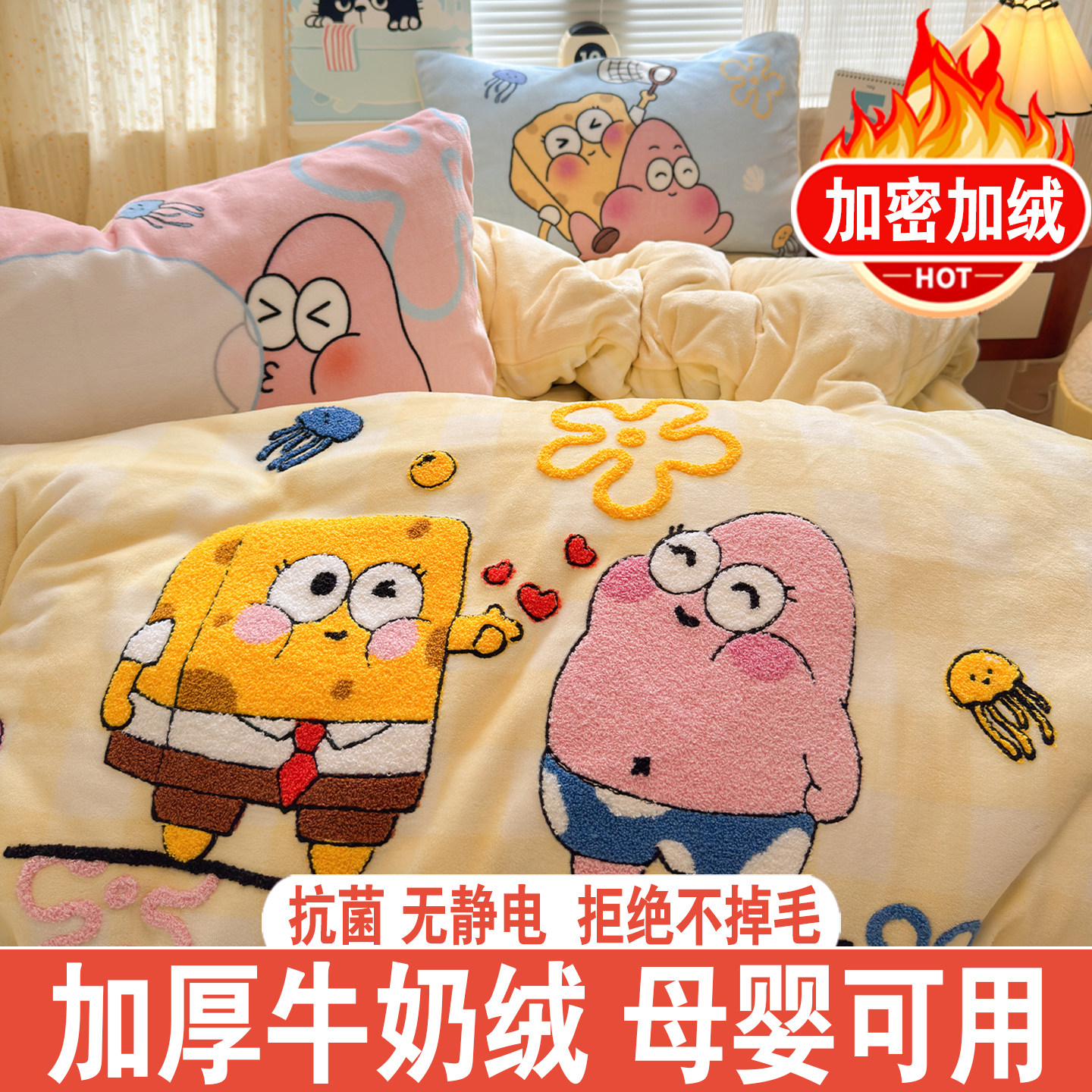 海绵宝宝牛奶绒床上四件套加厚珊瑚绒卡通被套法兰绒床单三件套