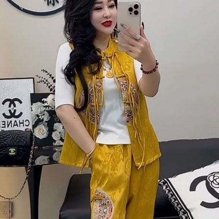 新中式时尚套装女2025春夏季新款高级感国风马甲半袖束脚裤三件套
