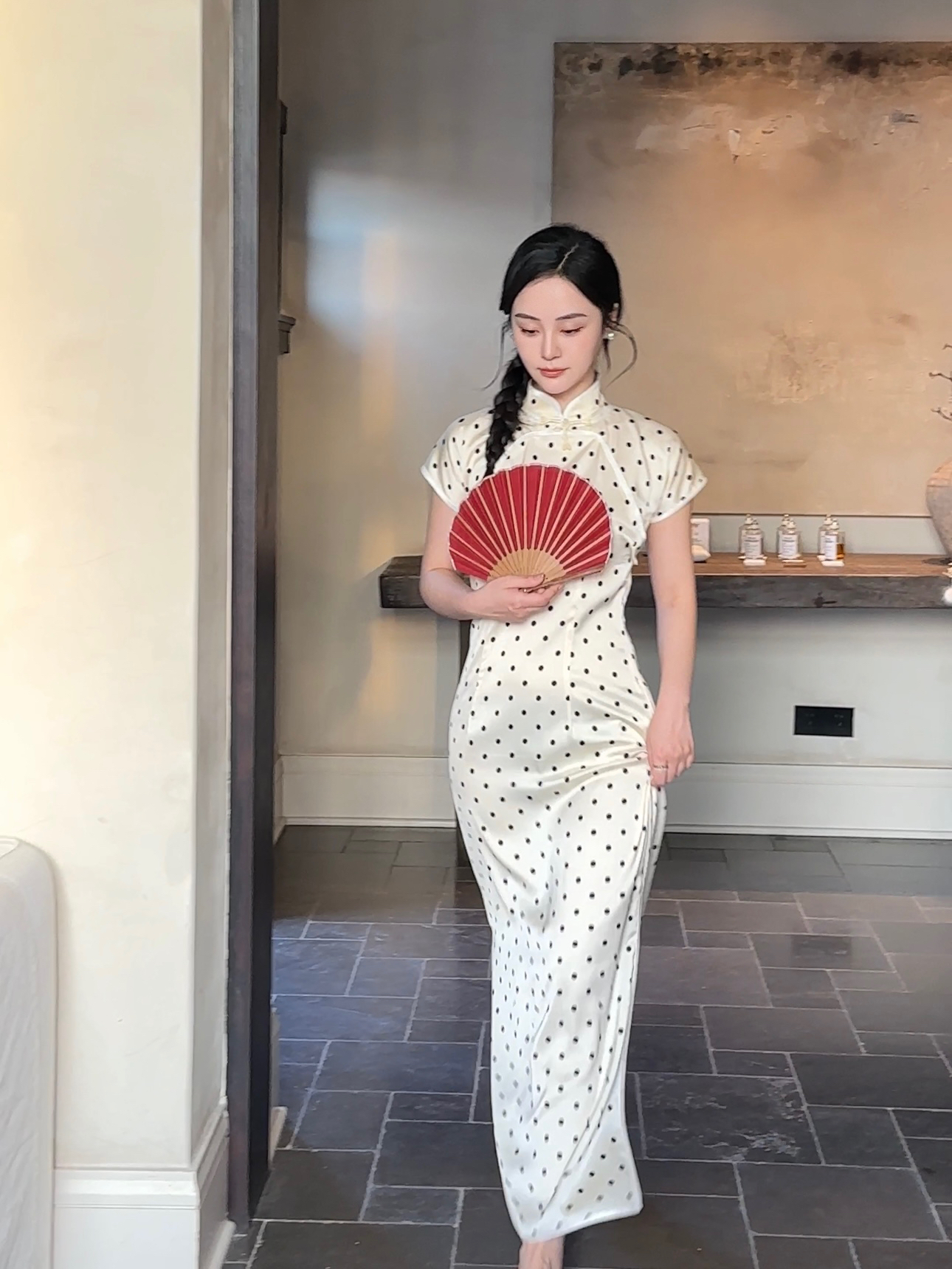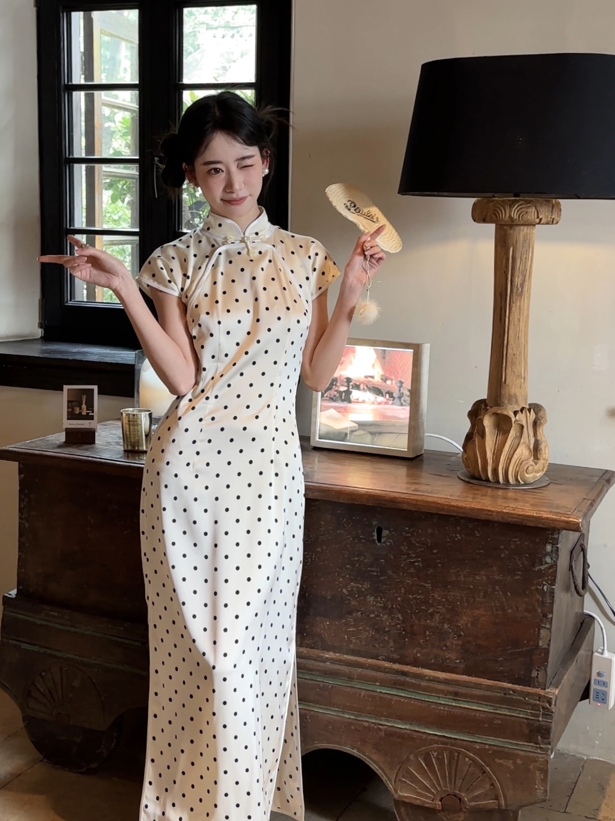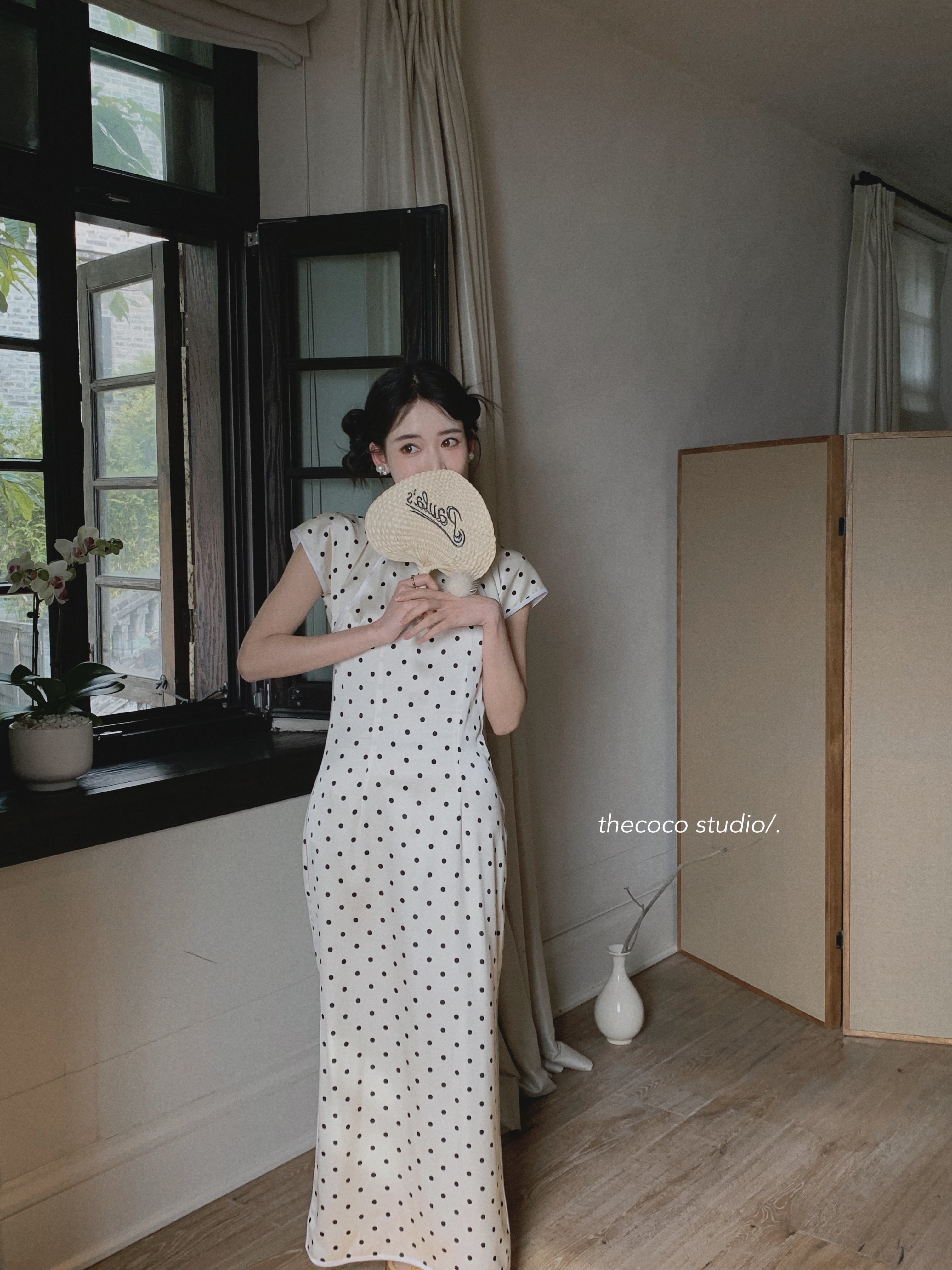 Thecoco 改良古法波点旗袍女夏季新款丝滑缎面垂坠感连肩显瘦长裙