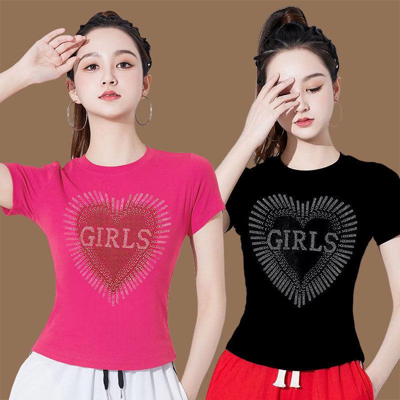 杨丽萍广场舞服装跳舞短袖上衣立体烫钻棉舞蹈服健身跳舞圆领上衣