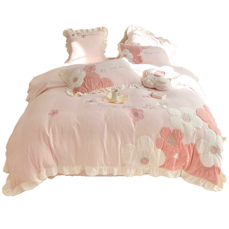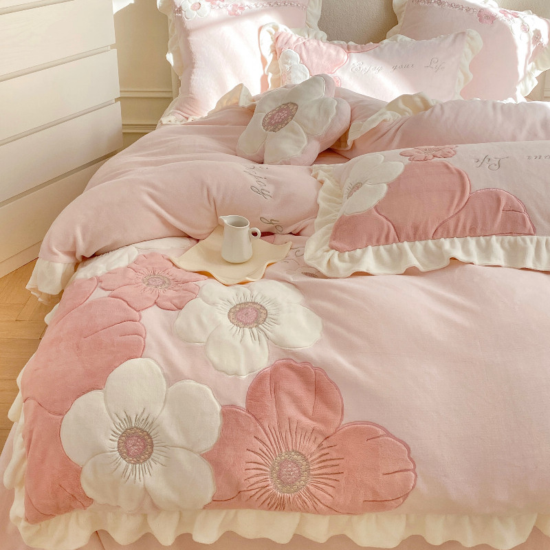 冬季少女保暖牛奶绒四件套加厚保暖双面珊瑚绒花朵贴布绣加绒被套