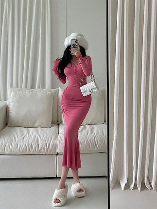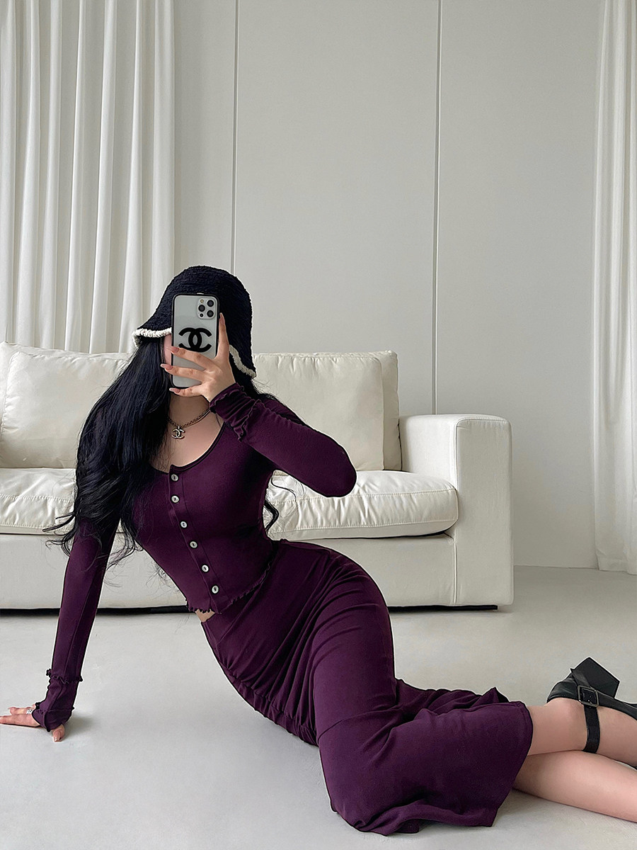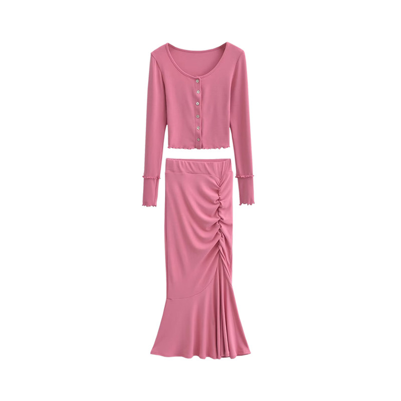 YoungGirlDay纯欲性感长袖单排扣开衫上衣高腰褶皱包臀鱼尾裙套装