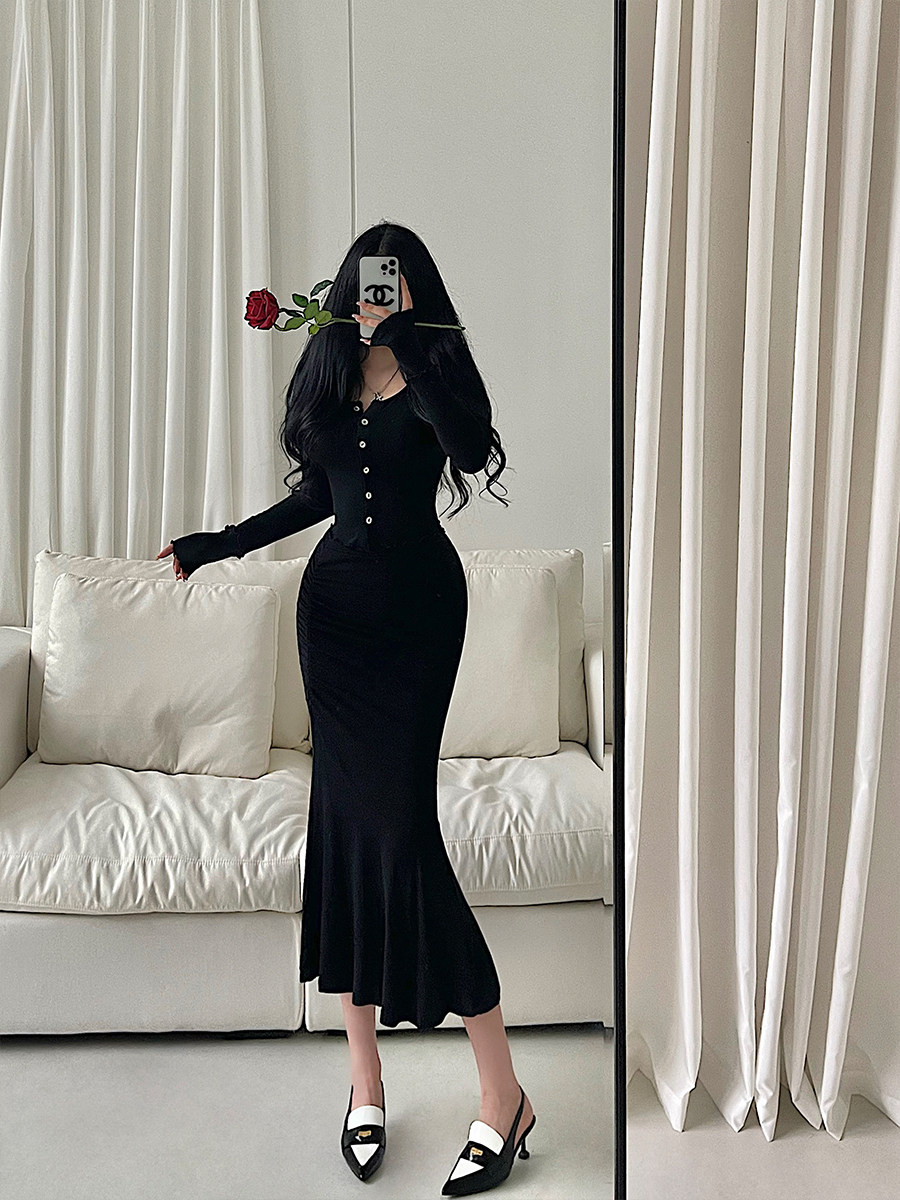 长袖单排扣开衫包臀鱼尾裙套装