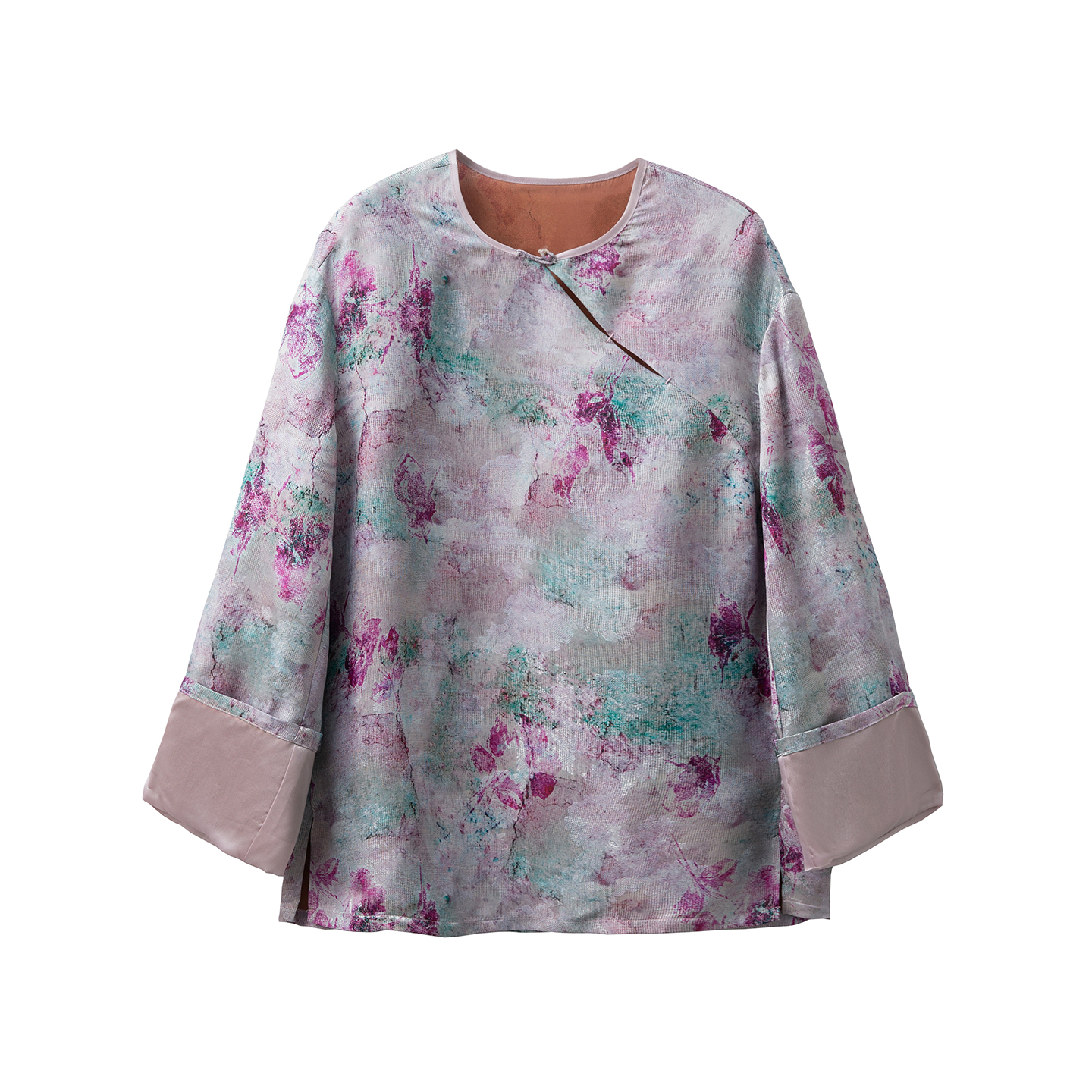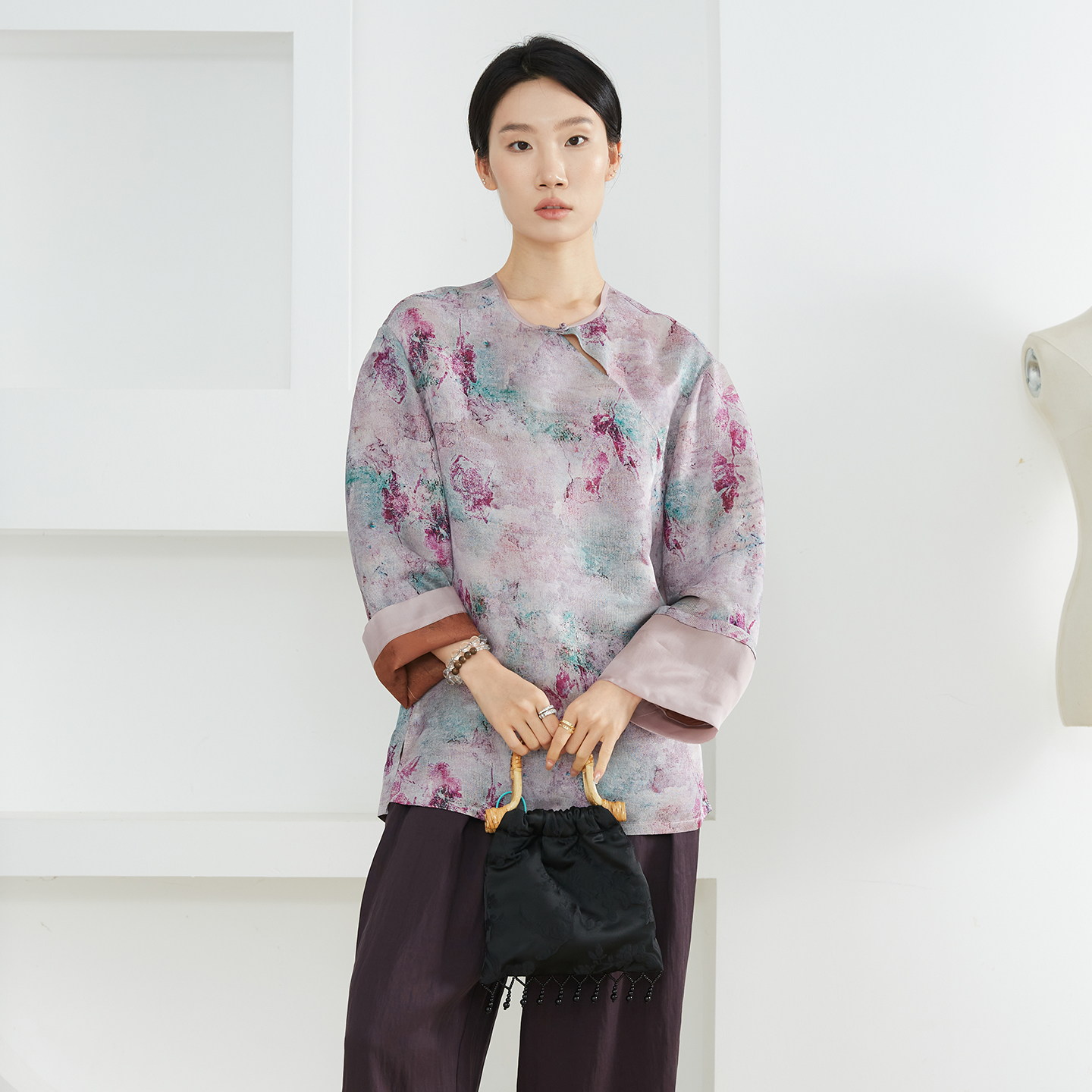 一丝牵100%桑蚕丝香云纱提花宽松真丝上衣女欧根纱挽袖小衫国风秋