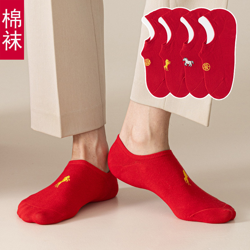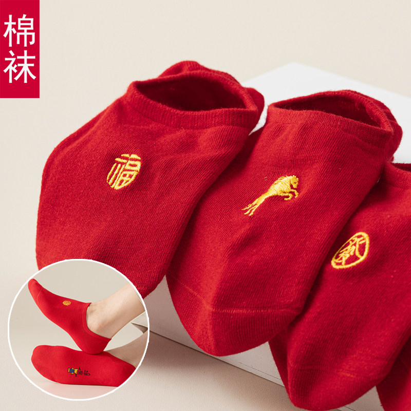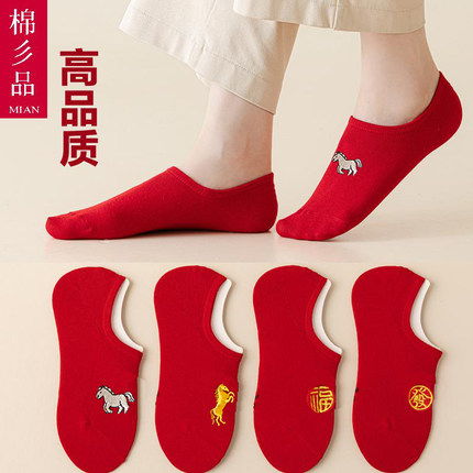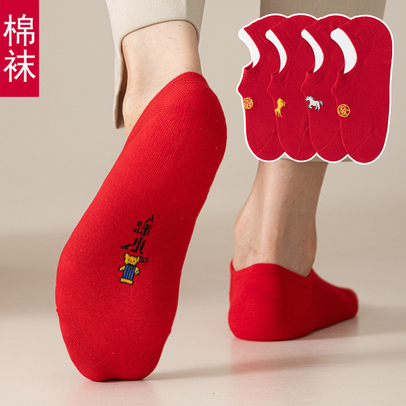 本命年红袜子属马年红色船袜春夏薄款浅口短袜男女情侣袜小人礼物