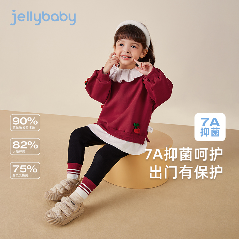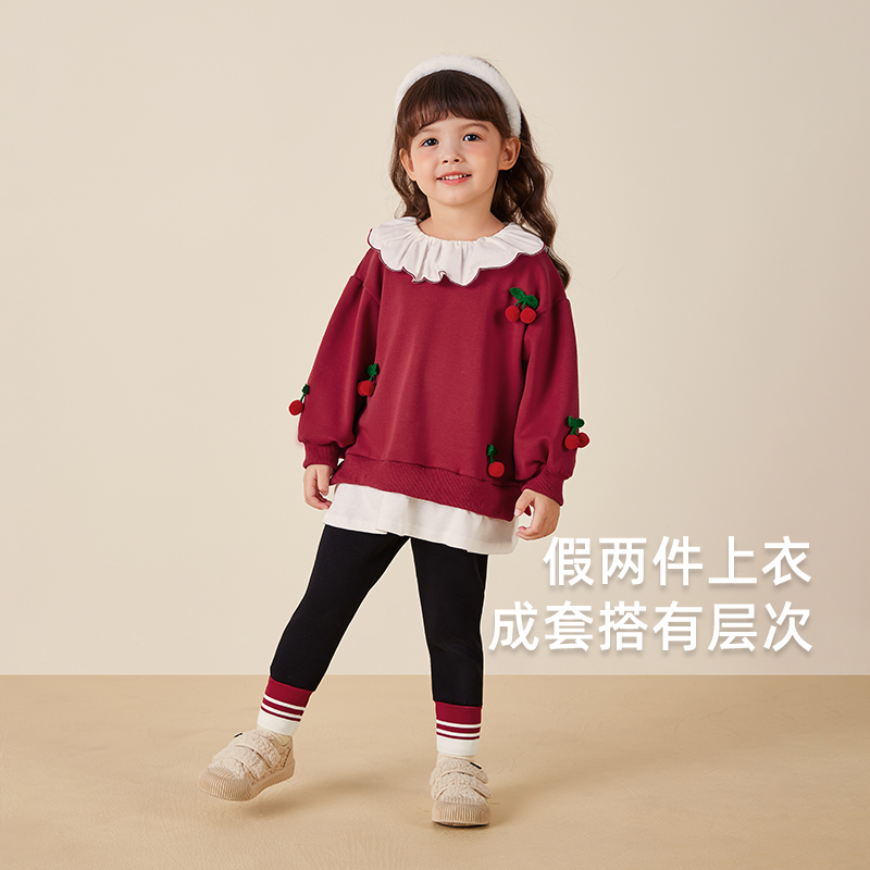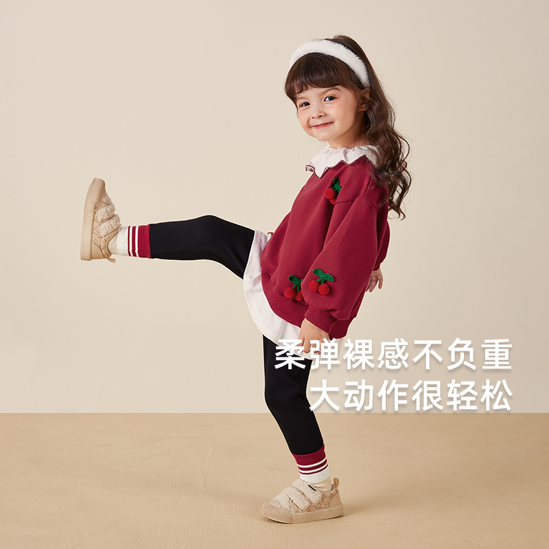 [抗菌锁温]女童秋冬两件套宝宝薄绒红色加绒套装卫衣儿童秋装衣服