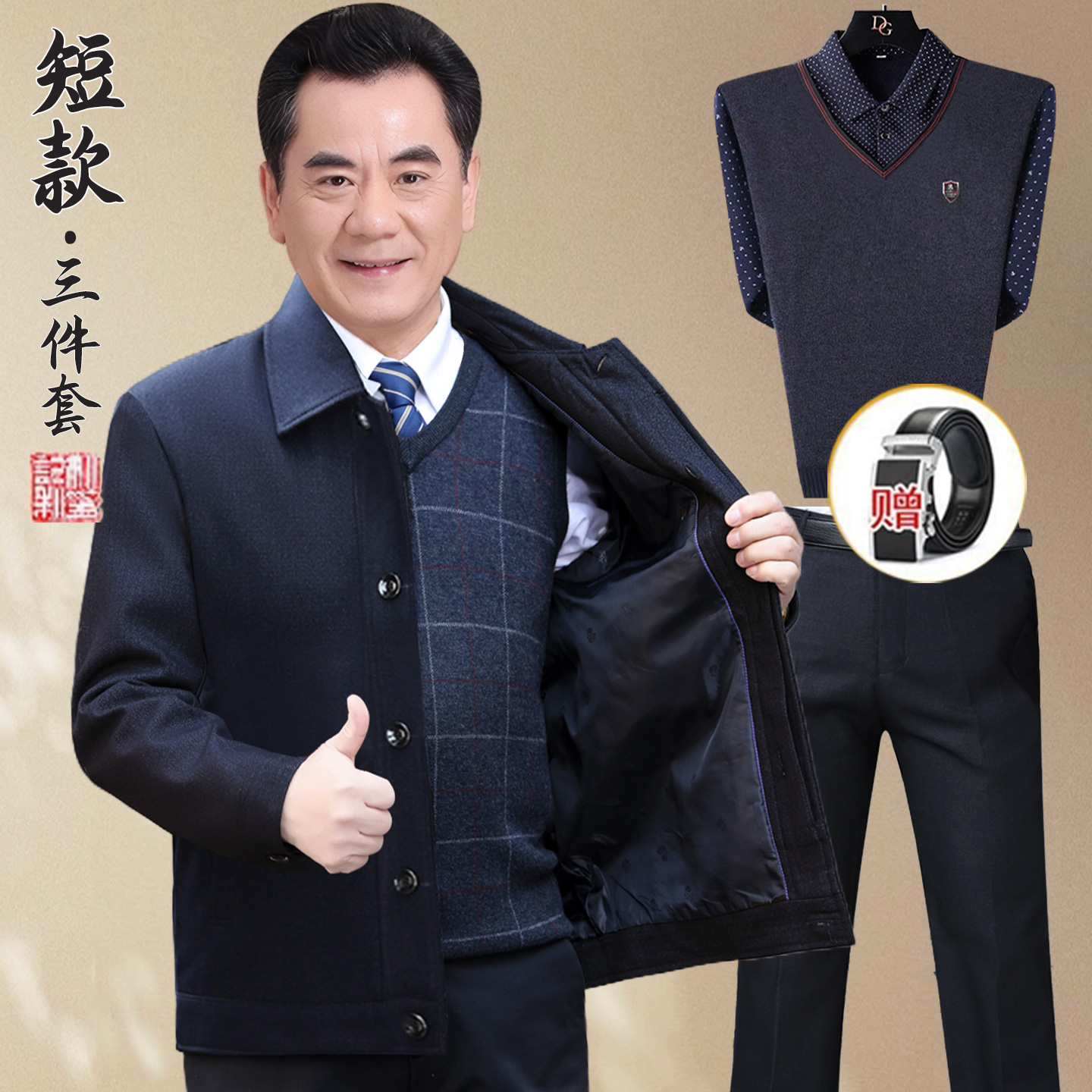 小个子爸爸夹克外套春秋款翻领中老年男士秋装套装短款老年人上衣